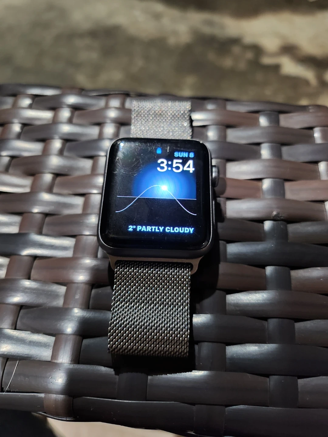 This is an Apple Watch Series 4 with a Milanese Loop band. It's a 44mm model. The watch displays the current time and weather.