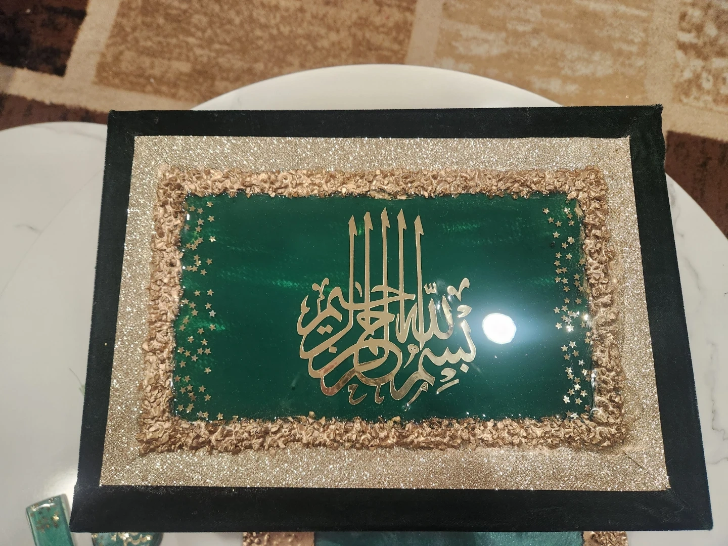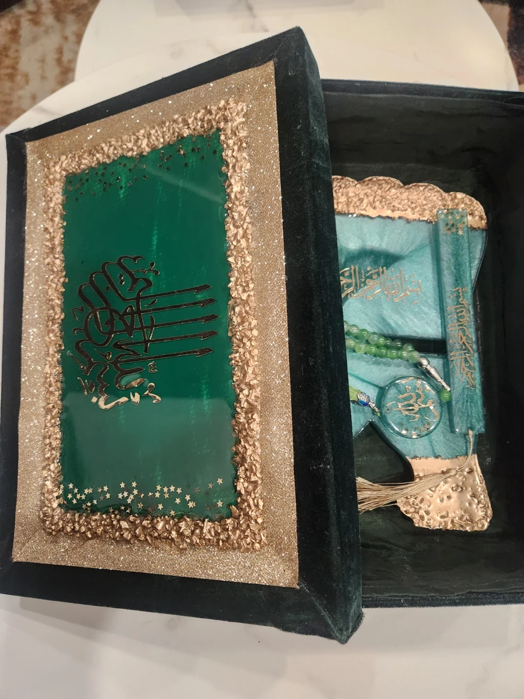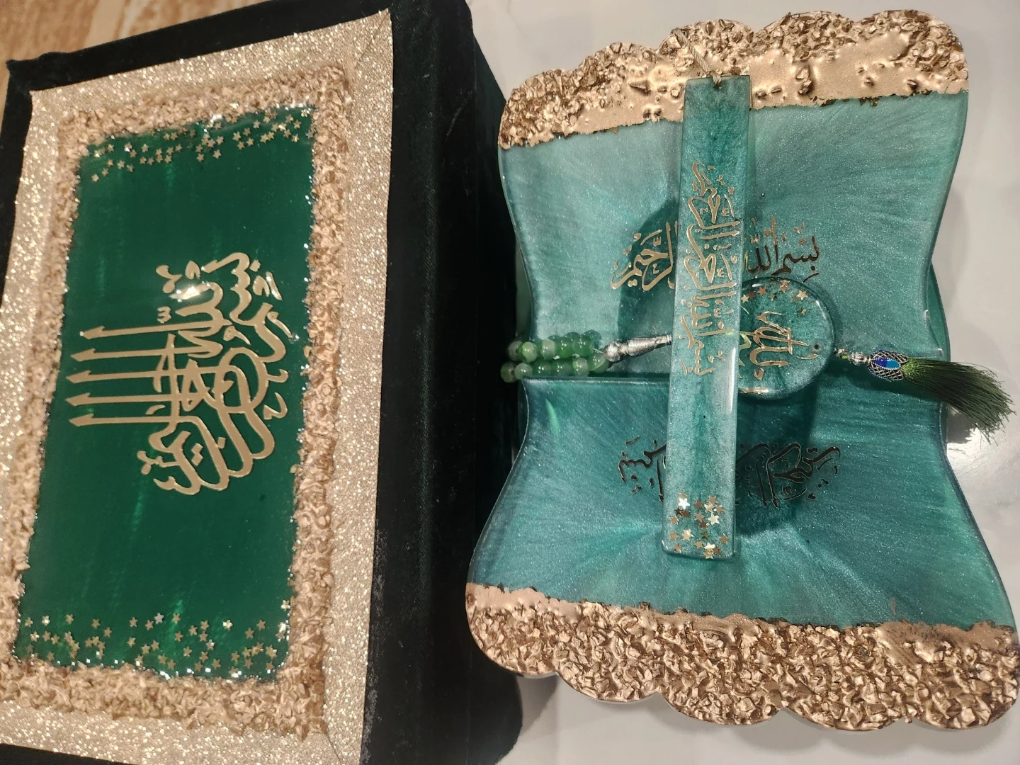 This decorative Quran stand is made of resin and features a teal and gold swirl design. It comes with a matching bookmark and a set of green prayer beads. The stand folds for easy storage. It's a beautiful display piece for any home.