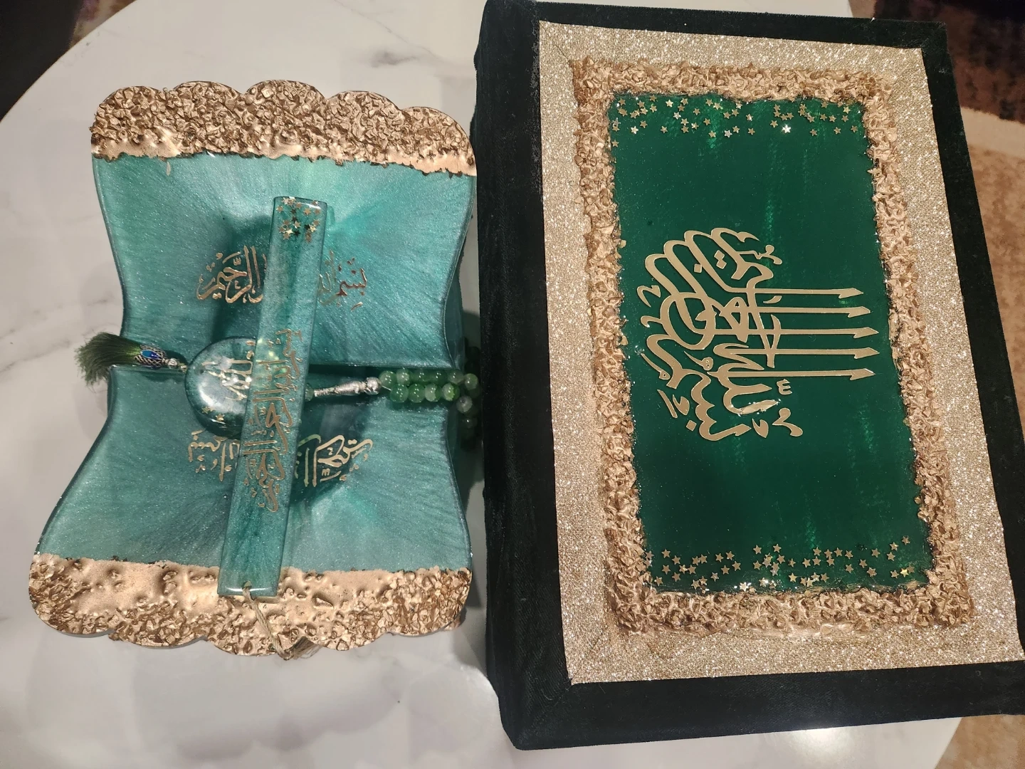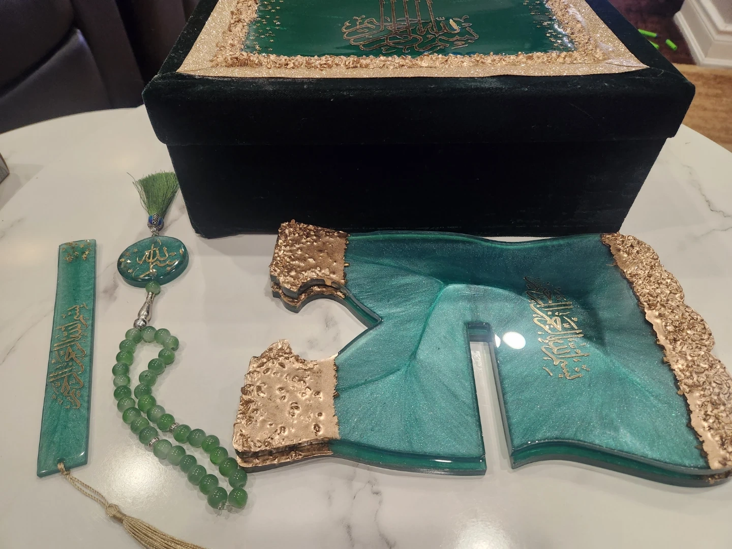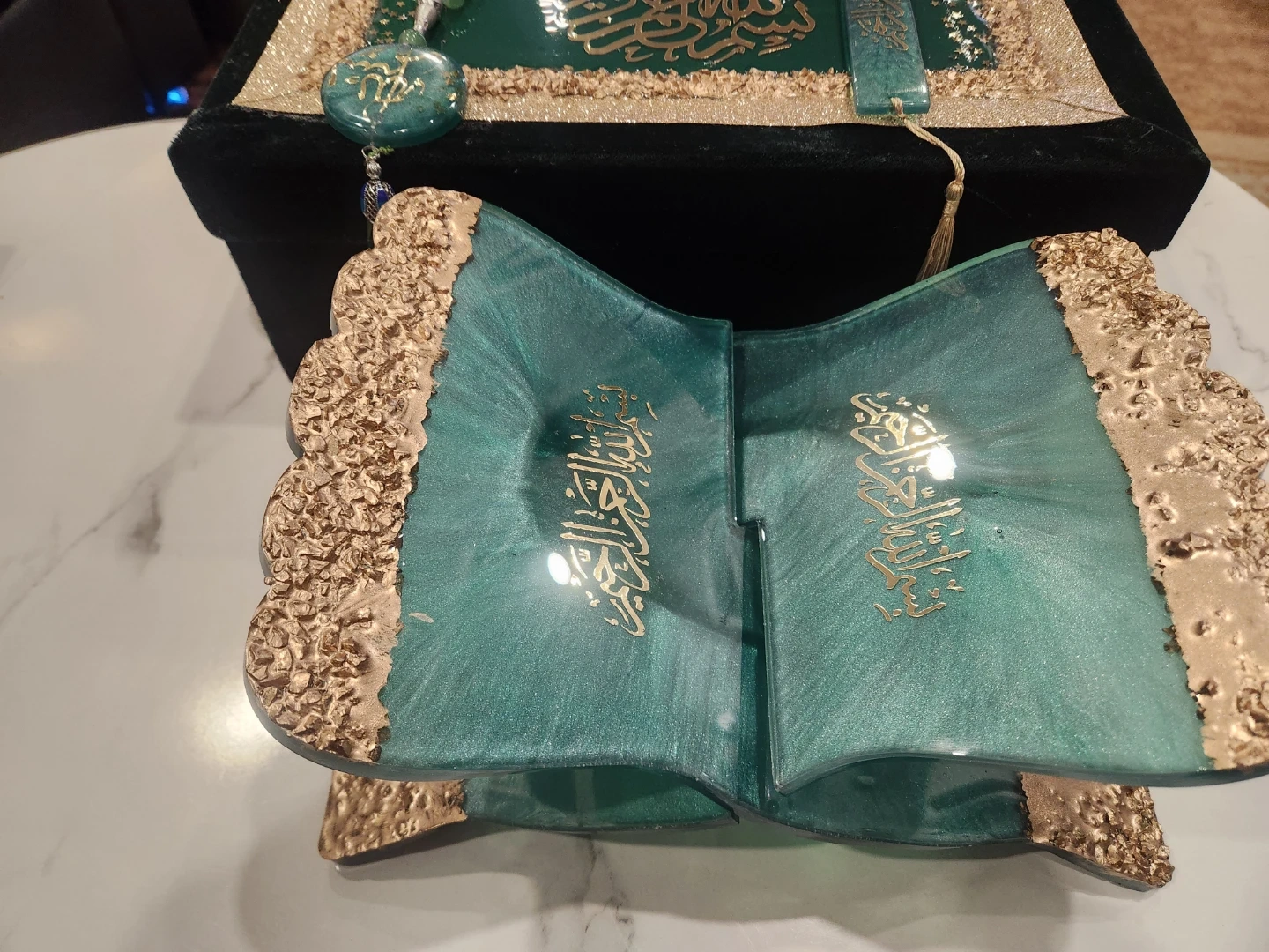 This decorative Quran stand is made of resin and features a teal and gold swirl design. It comes with a matching bookmark and a set of green prayer beads. The stand folds for easy storage. It's a beautiful display piece for any home.
