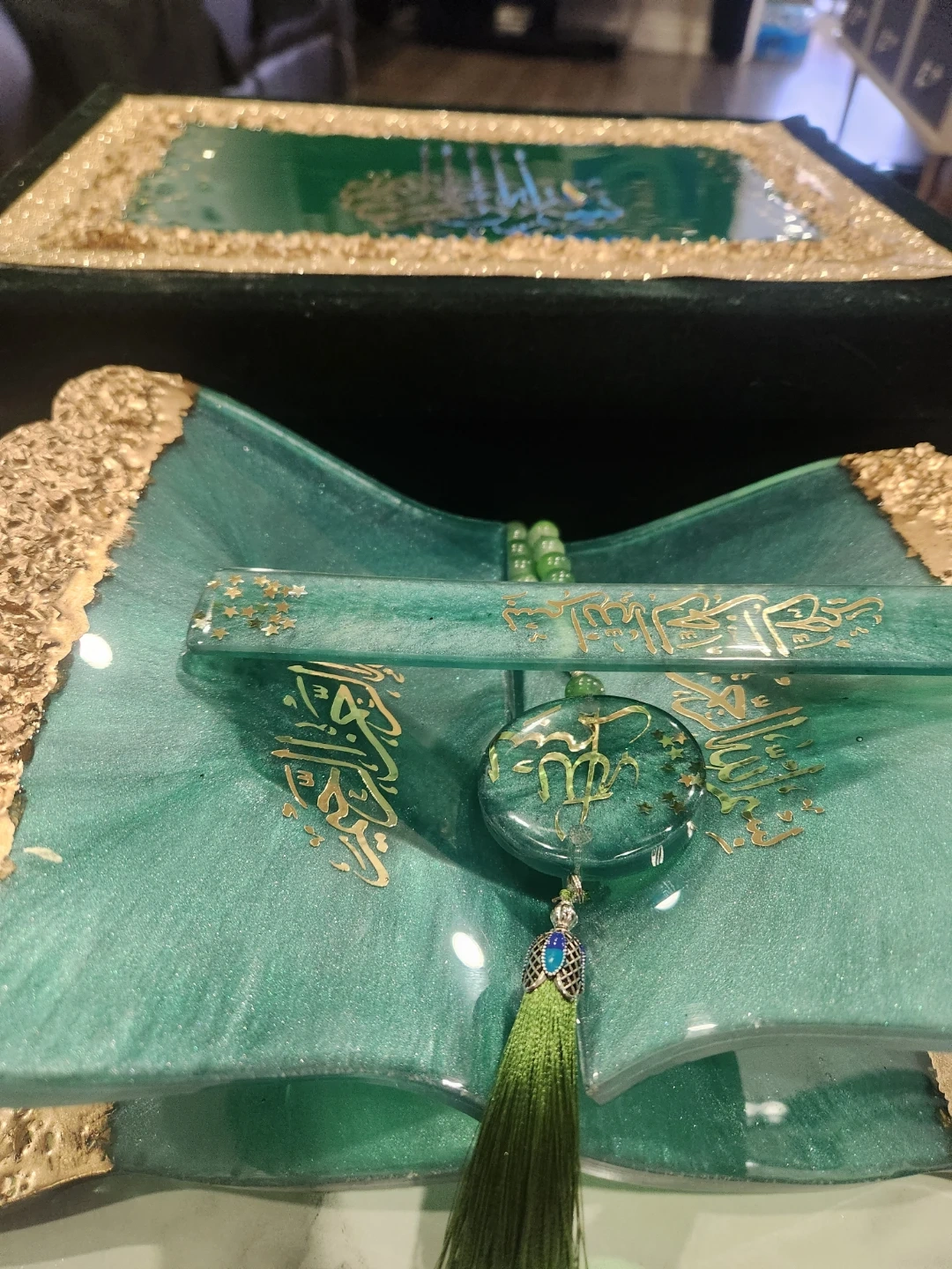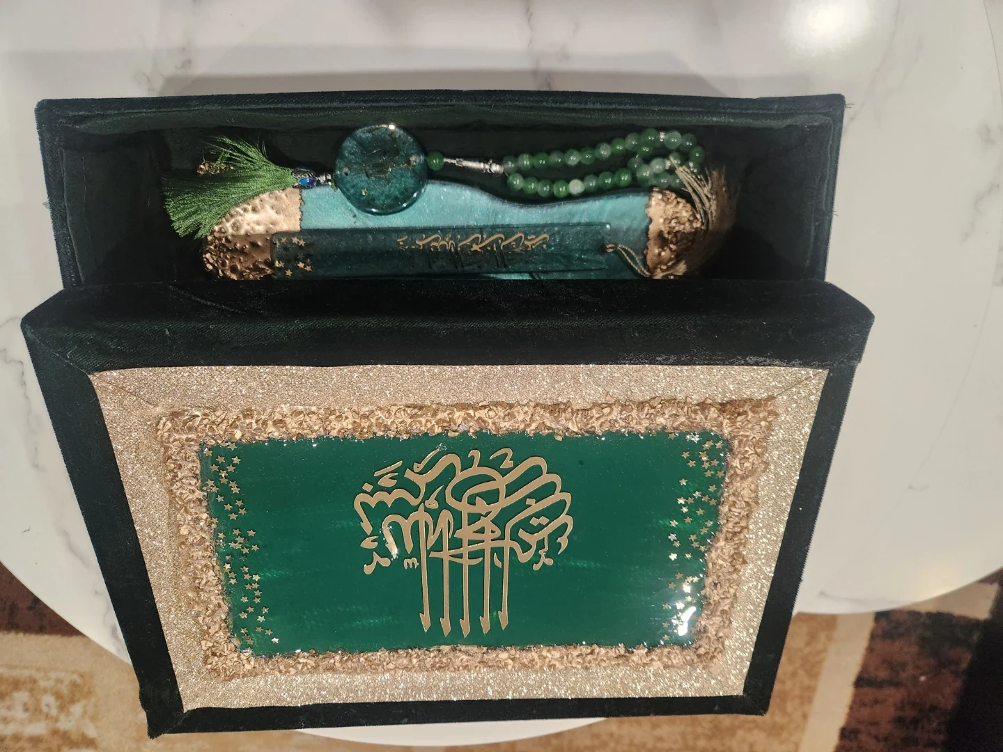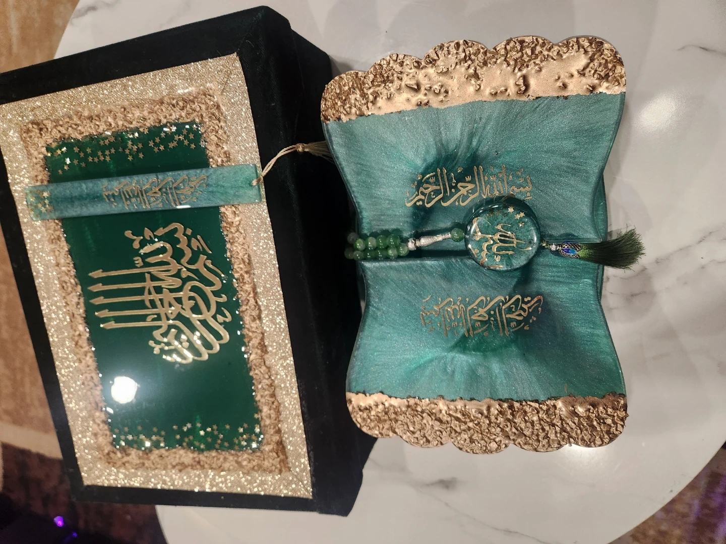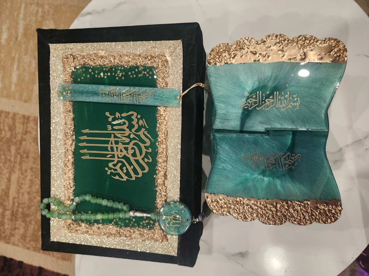 This decorative Quran stand is made of resin and features a teal and gold swirl design. It comes with a matching bookmark and a set of green prayer beads. The stand folds for easy storage. It's a beautiful display piece for any home.