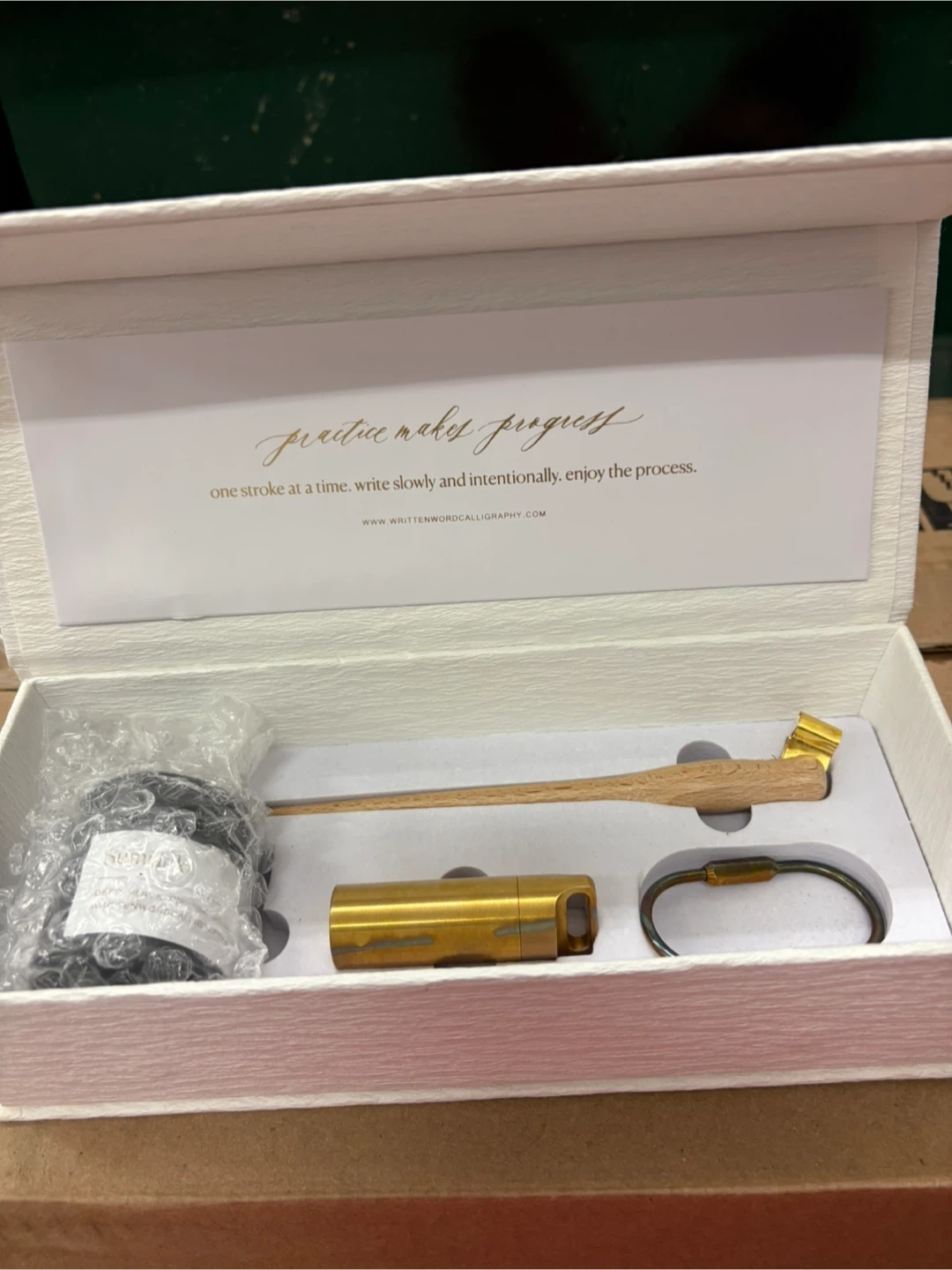 282Selling a beautiful calligraphy set from Written Word Calligraphy. Inever been used! Comes with all the original components in the box, including the ink, pen holder, brass flange, and other accessories. Perfect for anyone interested in learning calligraphy or practicing their skills