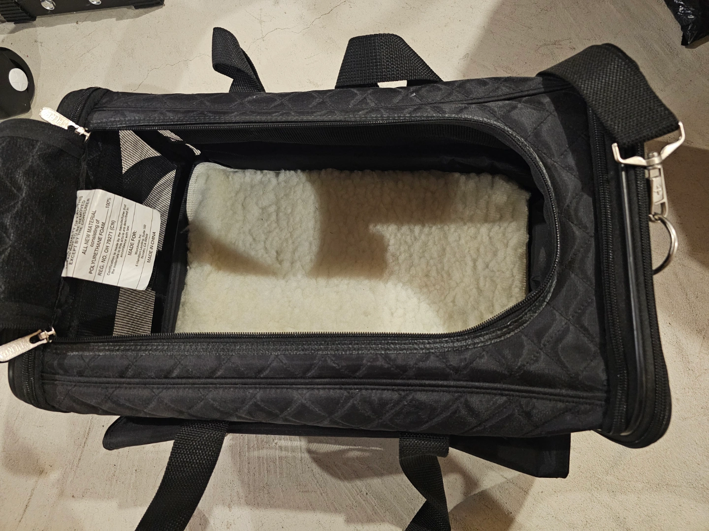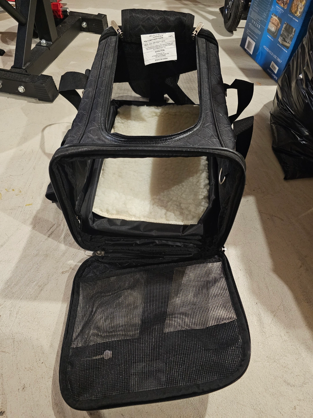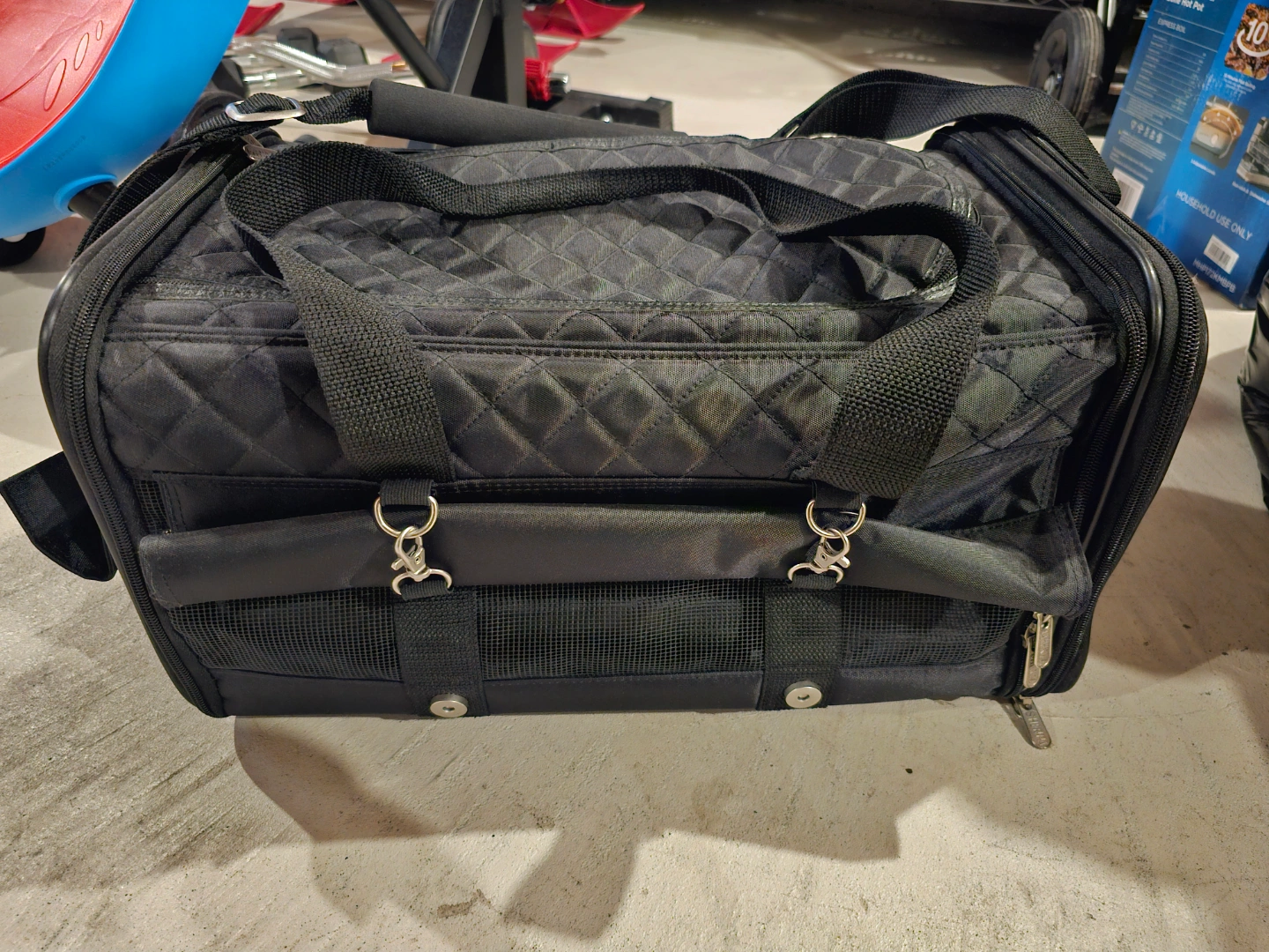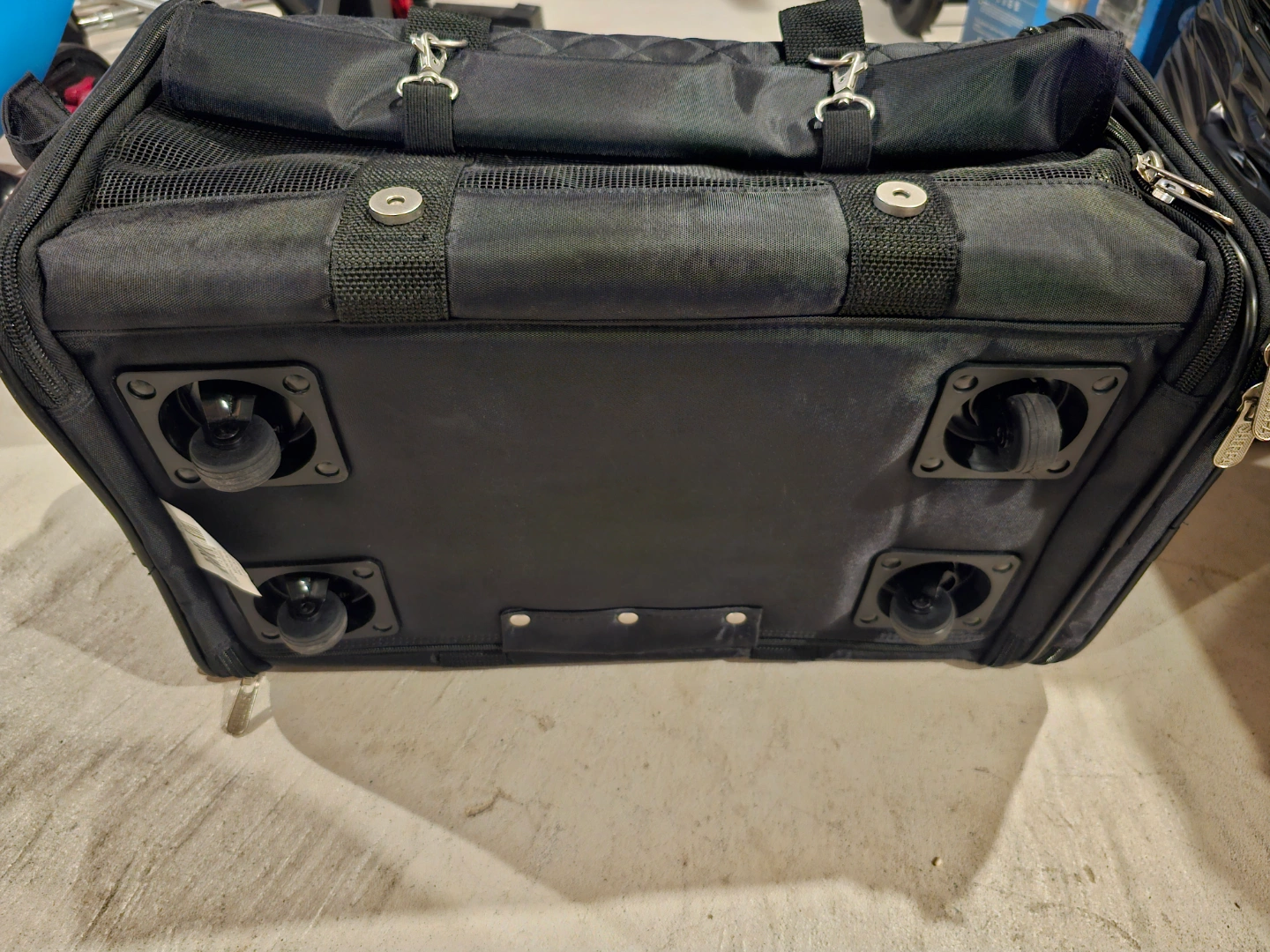 Black quilted pet carrier. Features wheels, handles, and mesh sides. Includes a soft fleece interior.