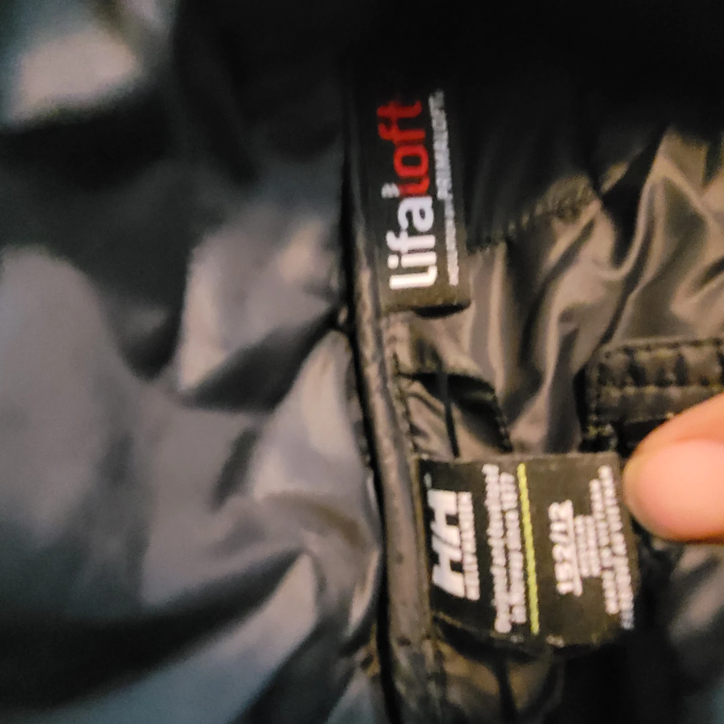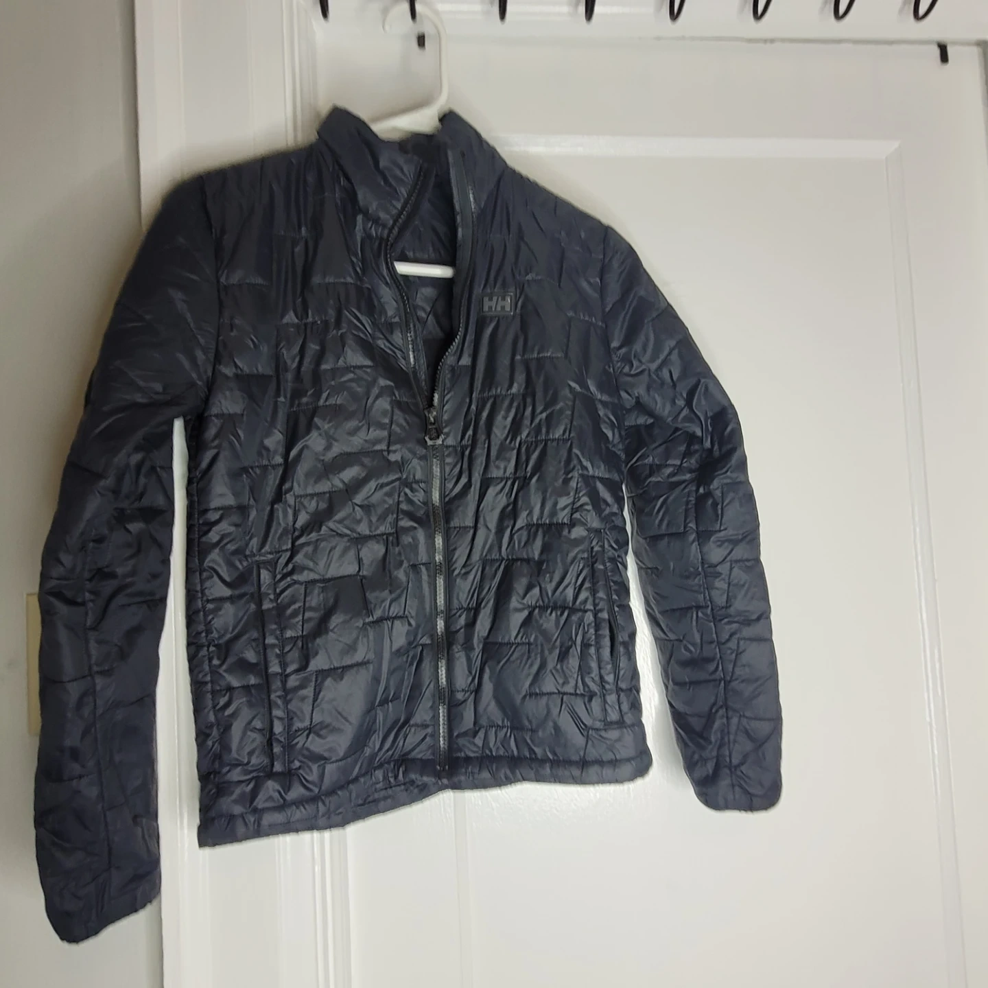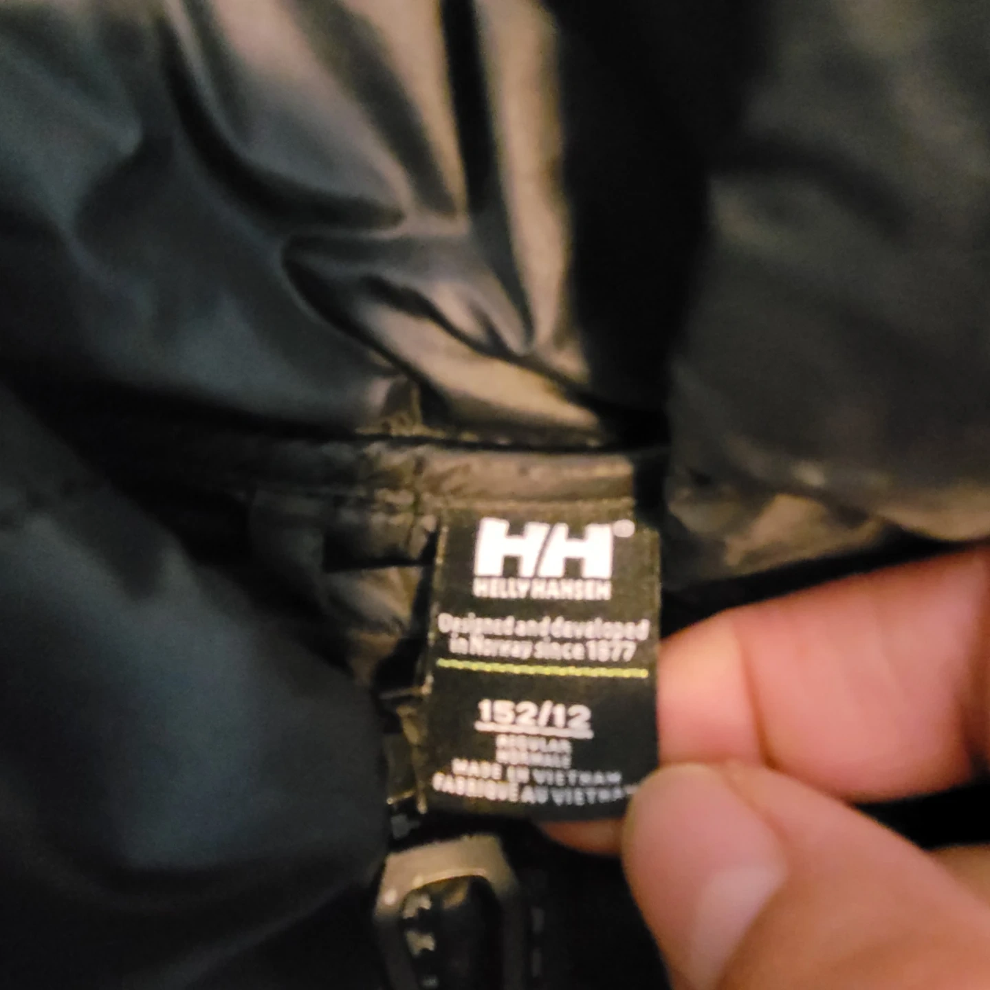 This is a Helly Hansen light puffer jacket. It's size 152/12. The jacket is designed and developed in Norway since 1977. It's filled with PrimaLoft insulation.