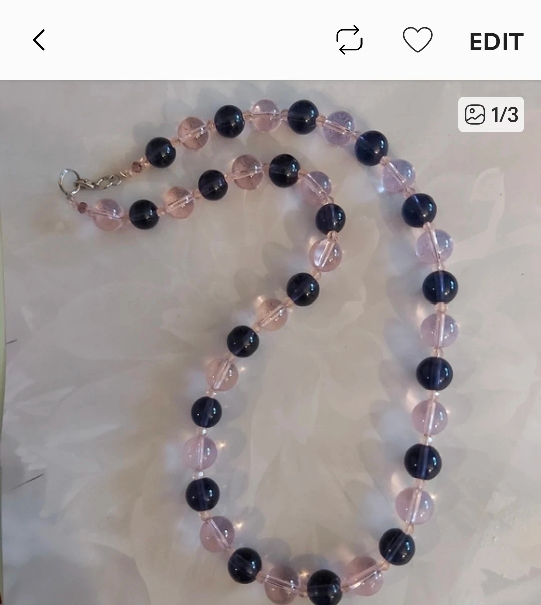 This necklace is made with pink and dark blue glass beads. It's strung on a durable cord and fastens with a silver-tone clasp. A simple accessory for everyday wear.