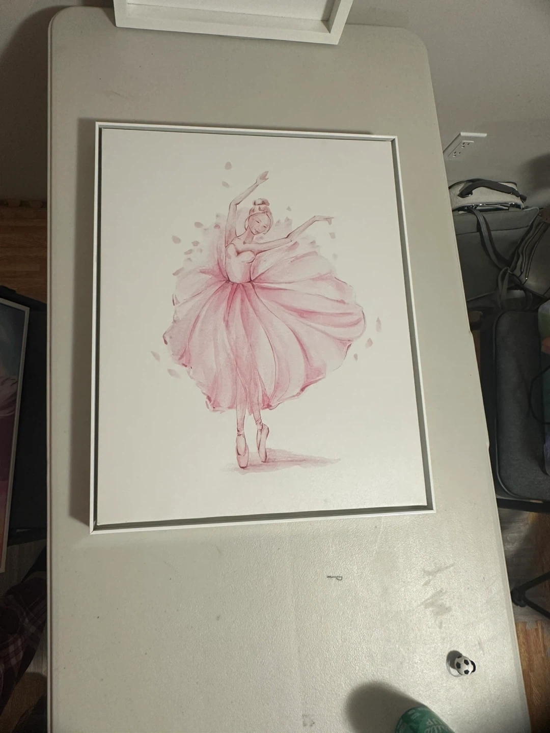 This is a canvas print featuring a watercolour-style illustration of a ballet dancer in a pink tutu. It comes in a simple white frame. This artwork would suit a child's bedroom or a dance studio.