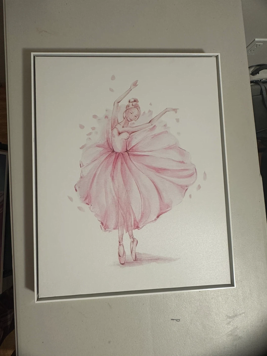 This is a canvas print featuring a watercolour-style illustration of a ballet dancer in a pink tutu. It comes in a simple white frame. This artwork would suit a child's bedroom or a dance studio.
