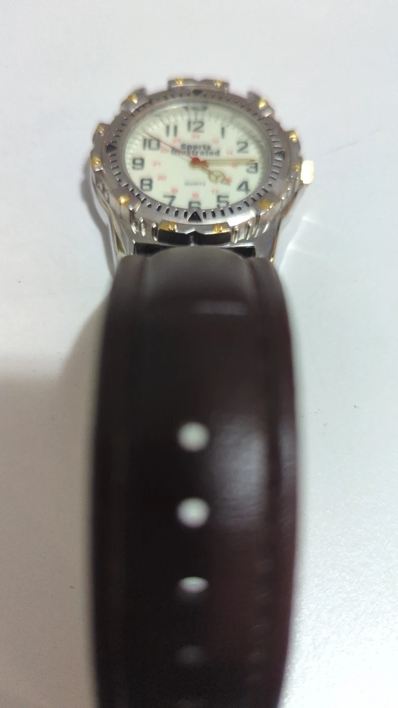 This is a Sports Illustrated quartz watch with a brown leather strap. It has a silver-tone case and a white dial with gold-tone accents. The strap is genuine leather and made in China. It's a practical timepiece for everyday wear.