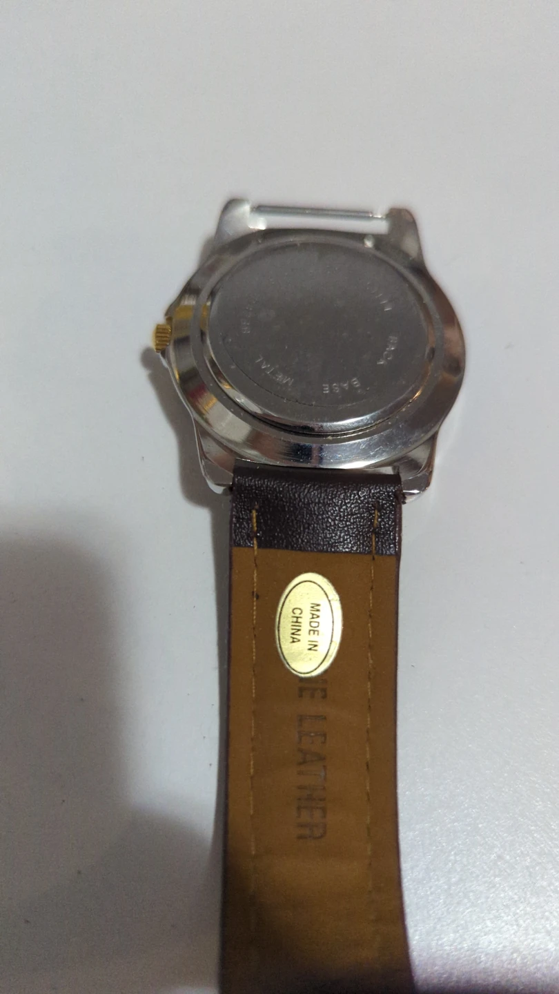 This is a Sports Illustrated quartz watch with a brown leather strap. It has a silver-tone case and a white dial with gold-tone accents. The strap is genuine leather and made in China. It's a practical timepiece for everyday wear.