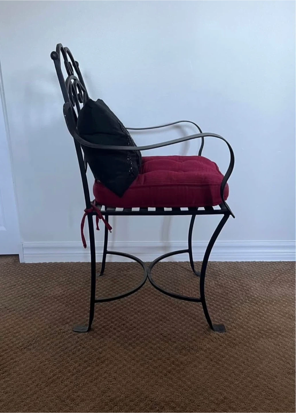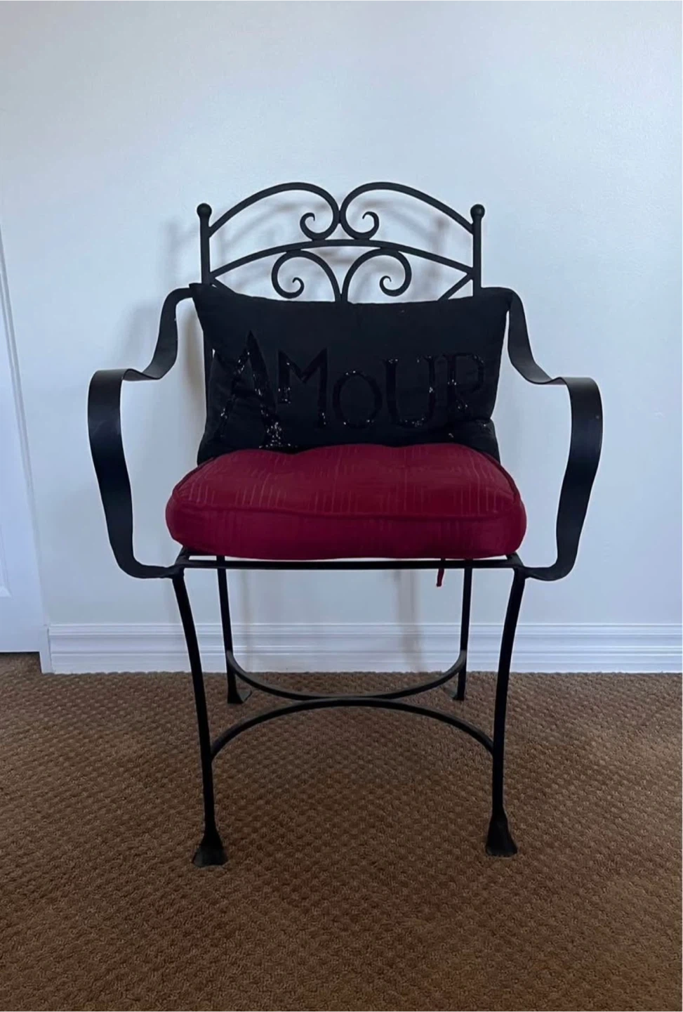 10Selling a wrought iron armchair, perfect for adding a touch of elegance to your home or garden! It comes with two cushions: a black decorative pillow with 'AMOUR' on it and a red seat cushion. The chair is sturdy and in good condition. It's a stylish and comfortable piece that would look great in any space