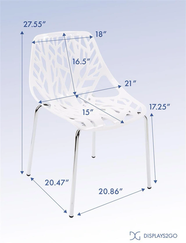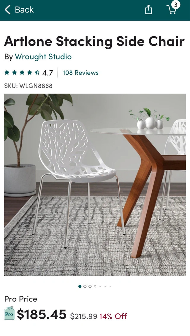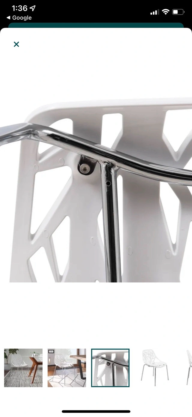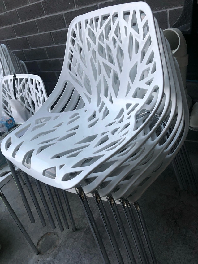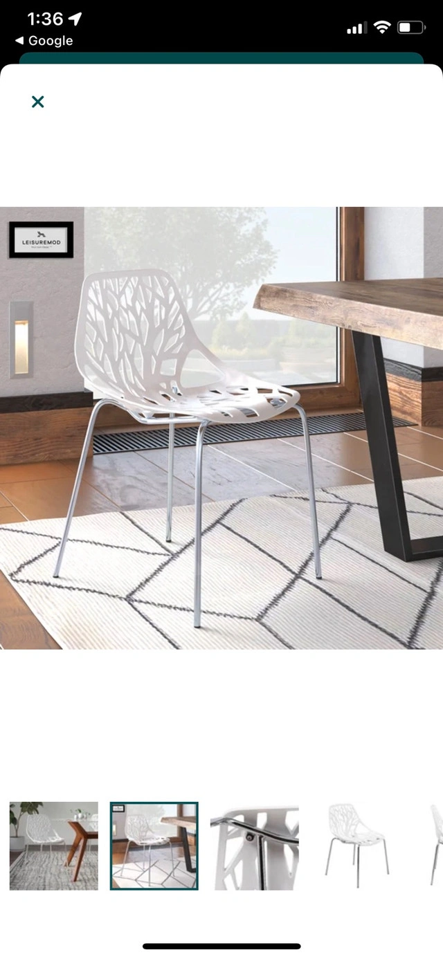 91Price is for one chair. Multiple chairs available. Make an offer for combo chairs. This stylish Wrought Studio side chair features a modern, tree-branch inspired back design and sleek chrome legs. These chairs are previously owned and show some signs of use, but they're still sturdy and ready to add a contemporary touch to your dining or living space. Features: * Unique tree-branch back design * Chrome legs * Stackable for easy storage If the ad is up, the chair is available.