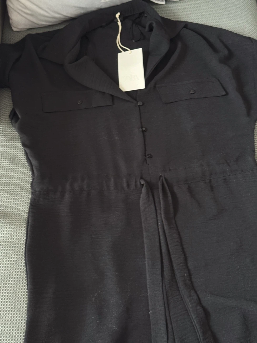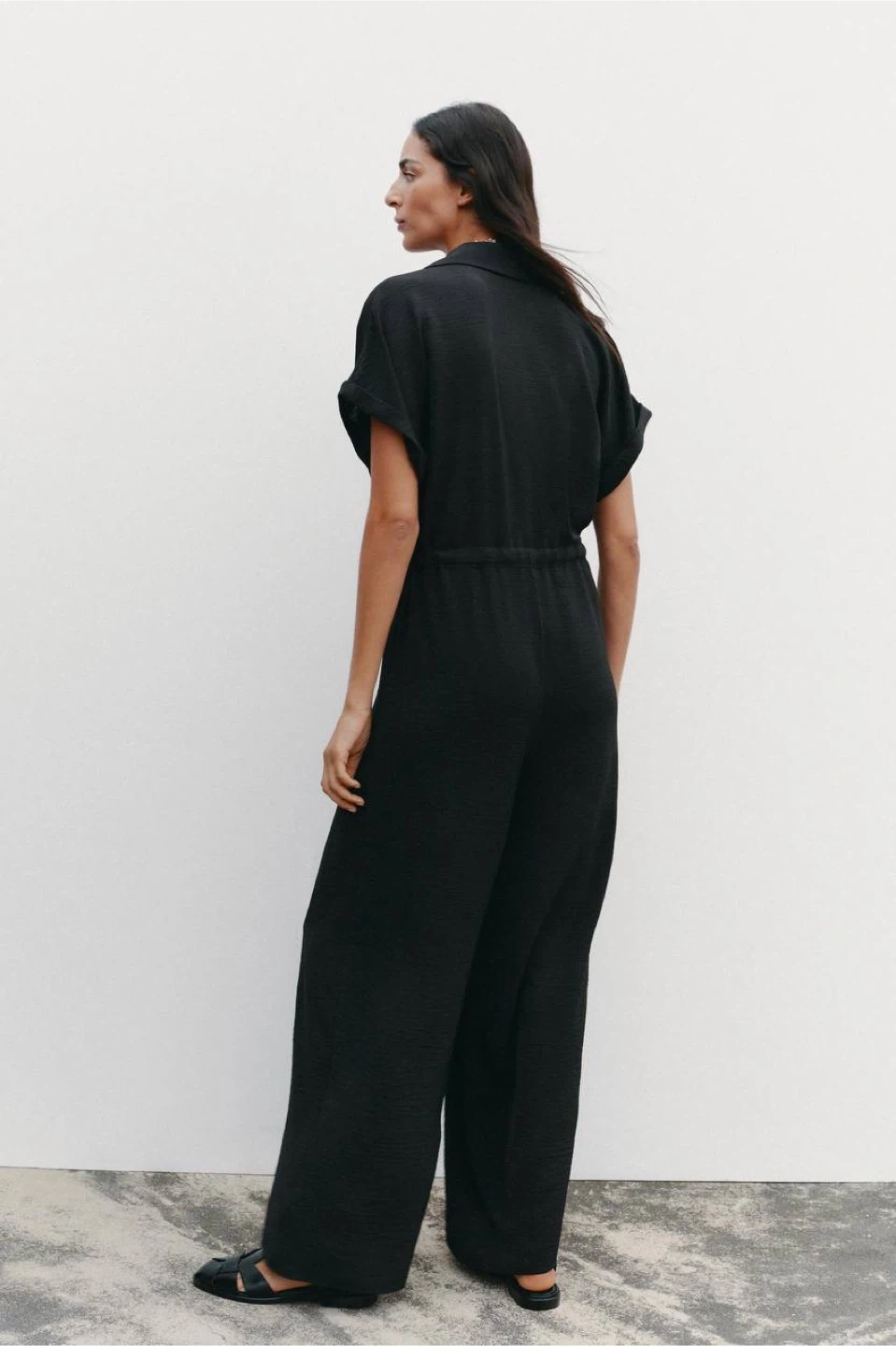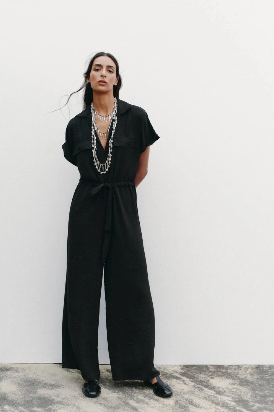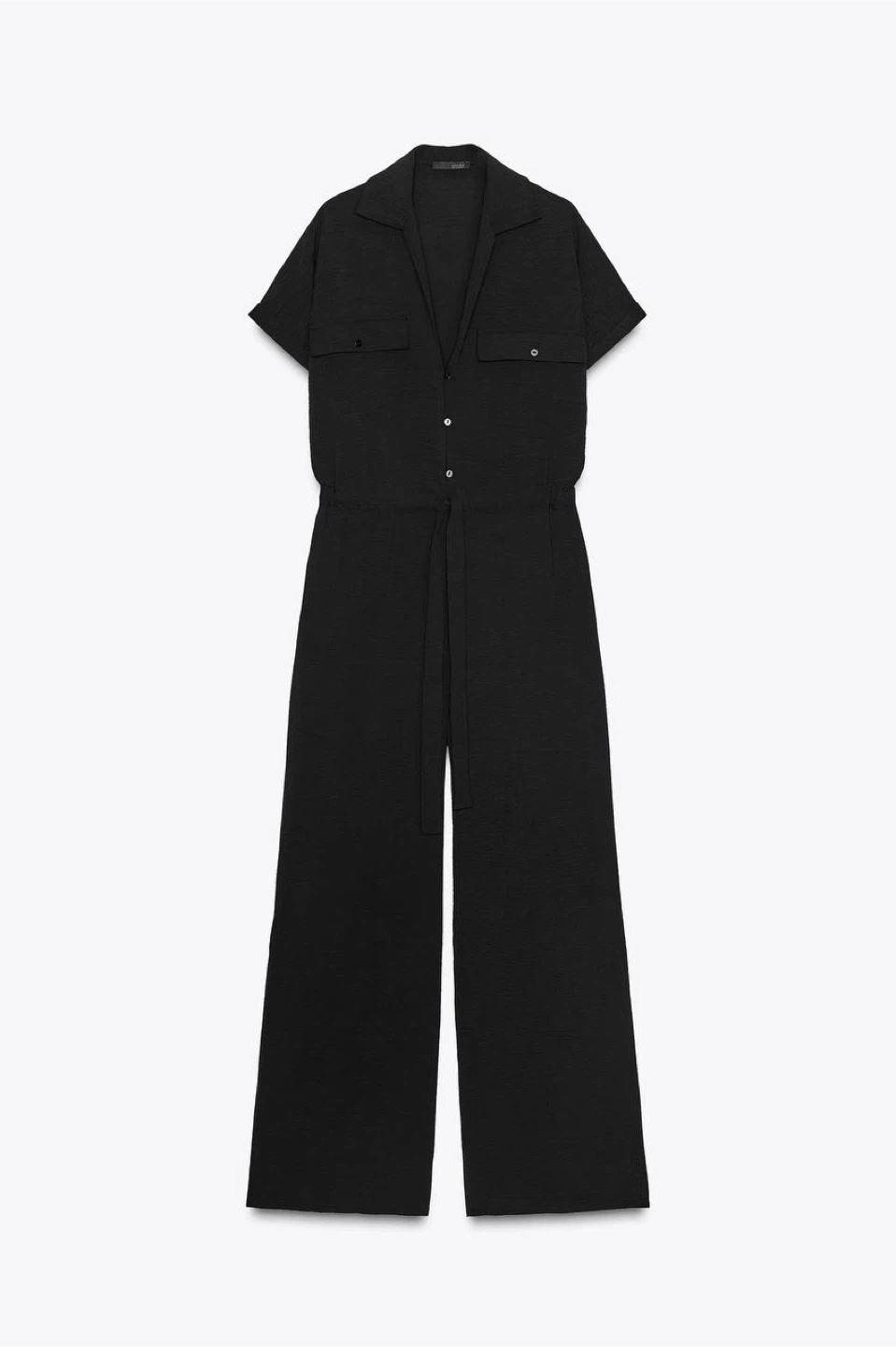 ZARA jumpsuit made from lightweight, flowing fabric. Features a lapel collar with a V-neckline, short sleeves with rolled hems, chest flap pockets, and metal button fastening. Adjustable drawstring waist for a comfortable and flattering fit.