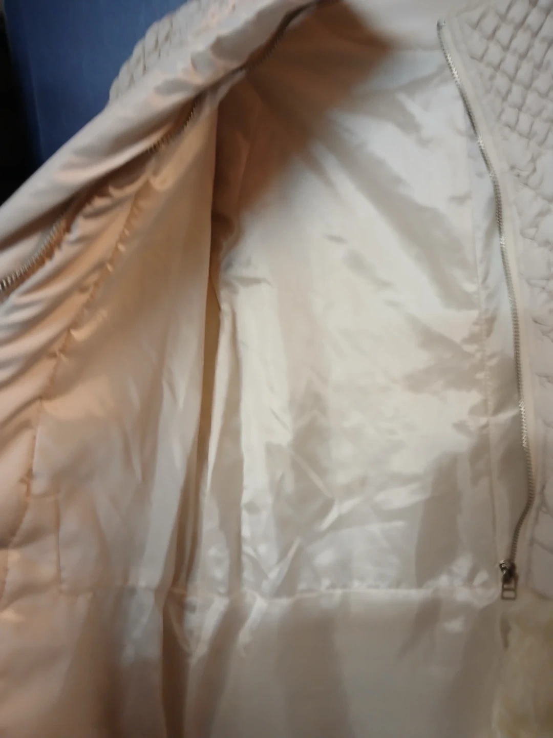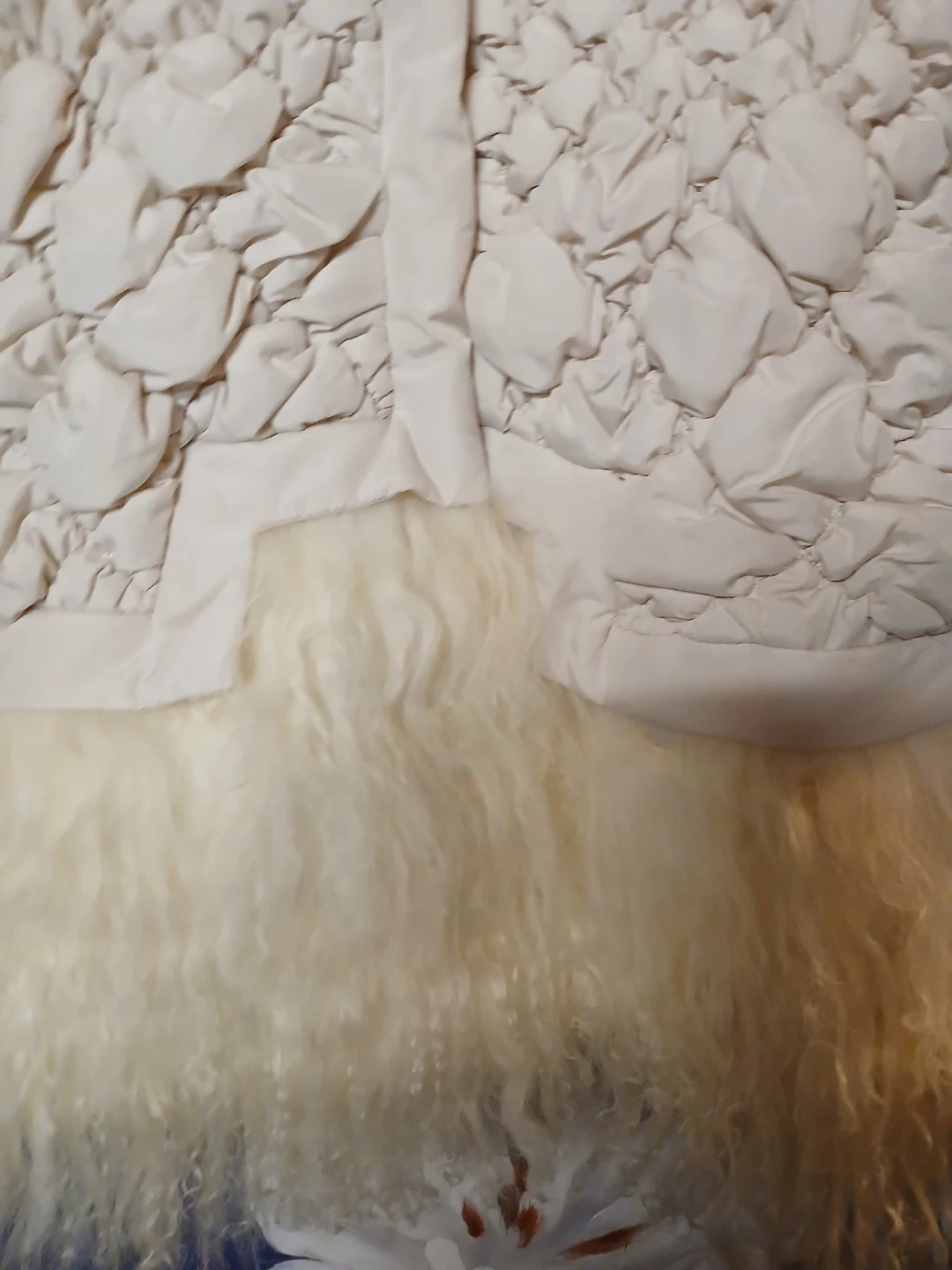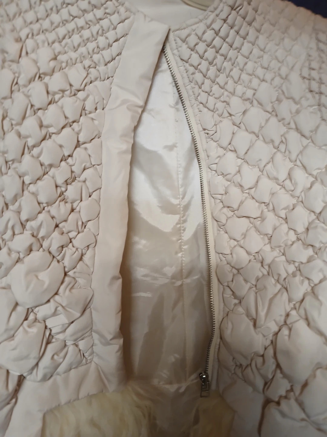 This cream-coloured jacket features a unique quilted design and a stylish fur trim. It's perfect for adding a touch of elegance to your wardrobe. The jacket has a zipper closure and long sleeves. It's in great condition and ready for a new owner!