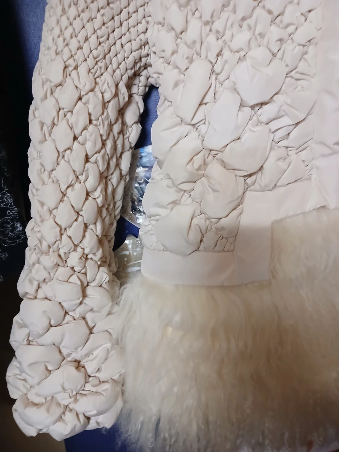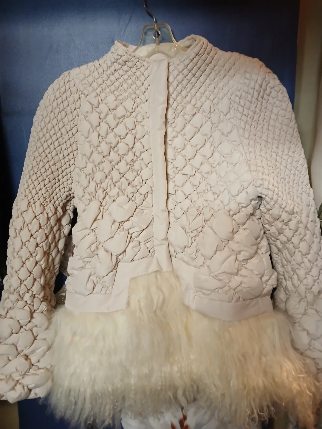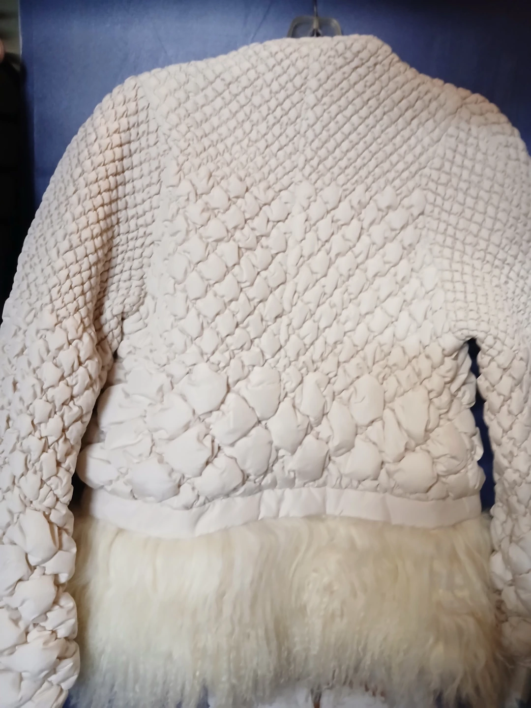 This cream-coloured jacket features a unique quilted design and a stylish fur trim. It's perfect for adding a touch of elegance to your wardrobe. The jacket has a zipper closure and long sleeves. It's in great condition and ready for a new owner!