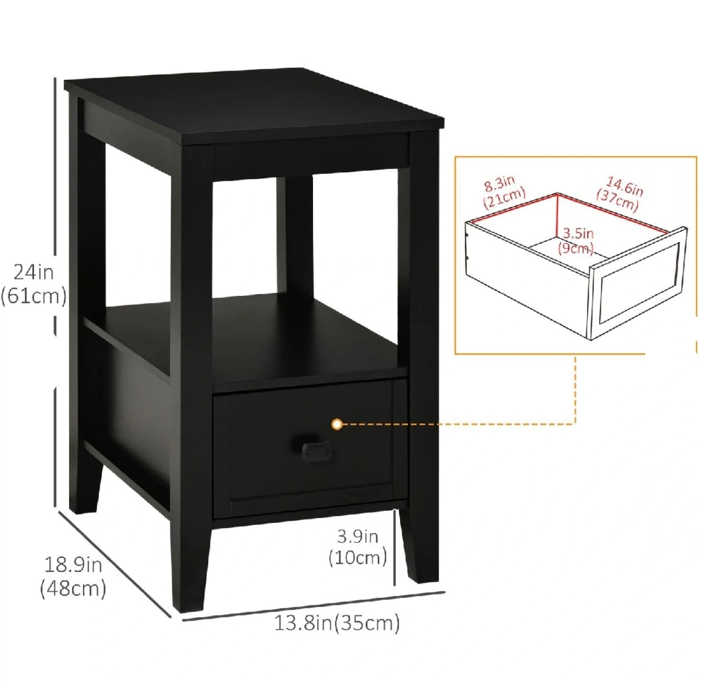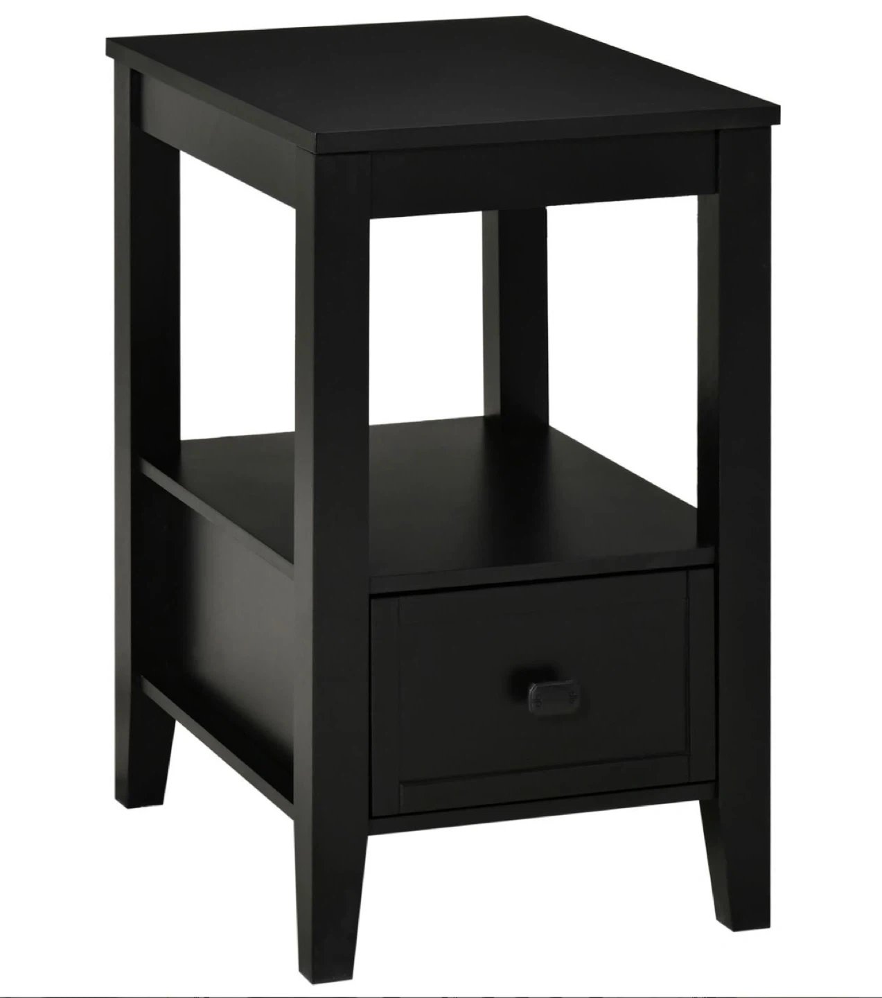 This HOMCOM modern side table, brand new in its original packaging, features a sleek black finish and offers a compact design perfect for any bedroom or living space. It includes a drawer for storage and an open shelf for display, blending functionality with style. This versatile end table is perfect for adding a touch of elegance to your living room or bedroom.
