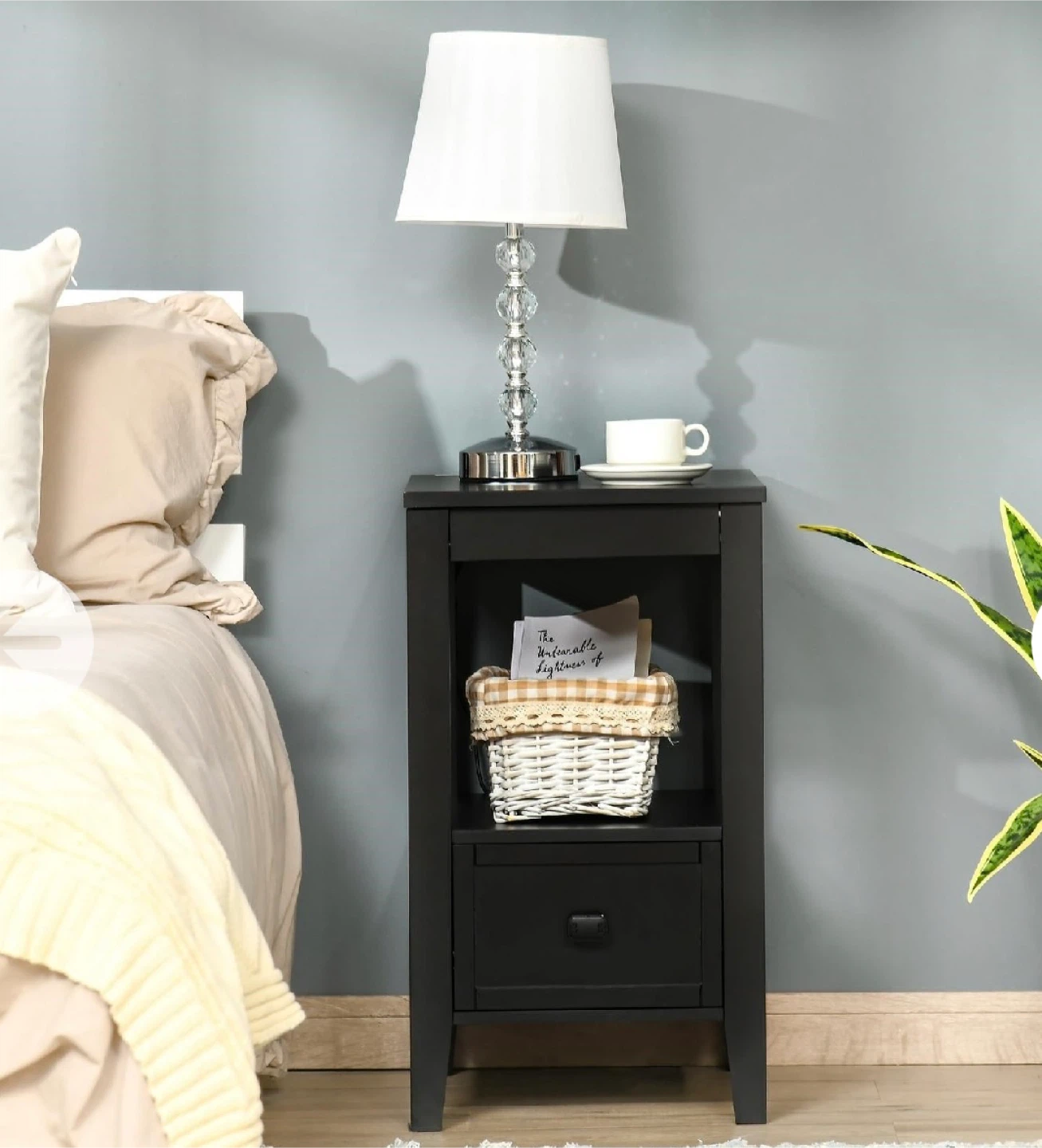 * Compact design with a drawer and open shelf