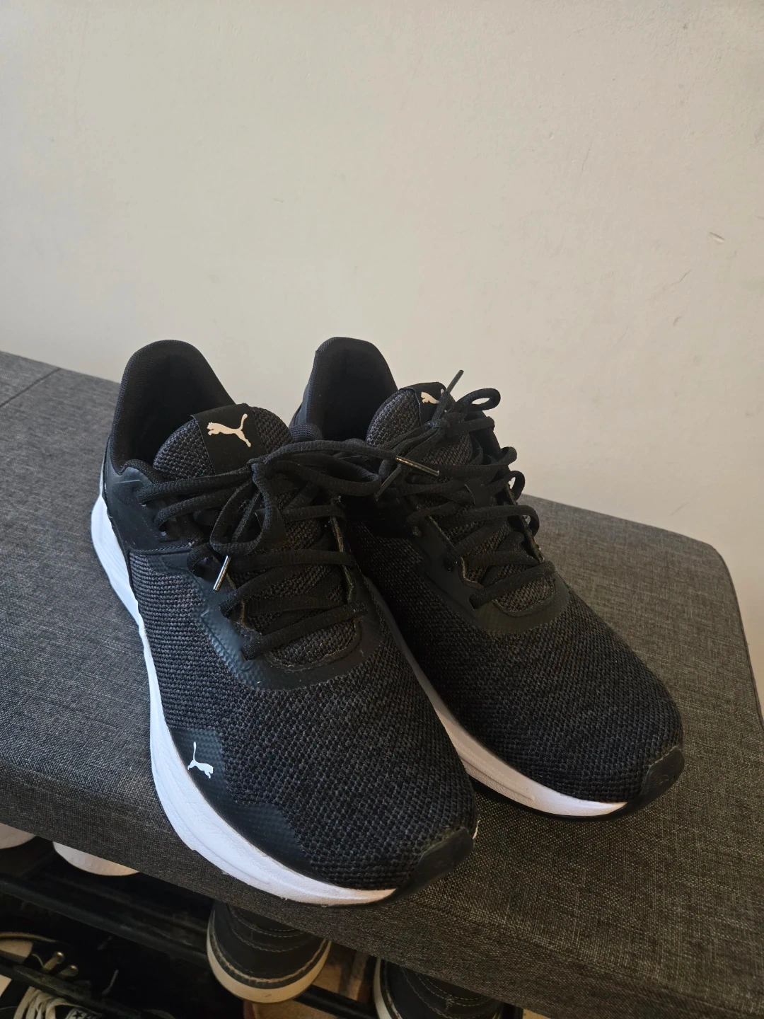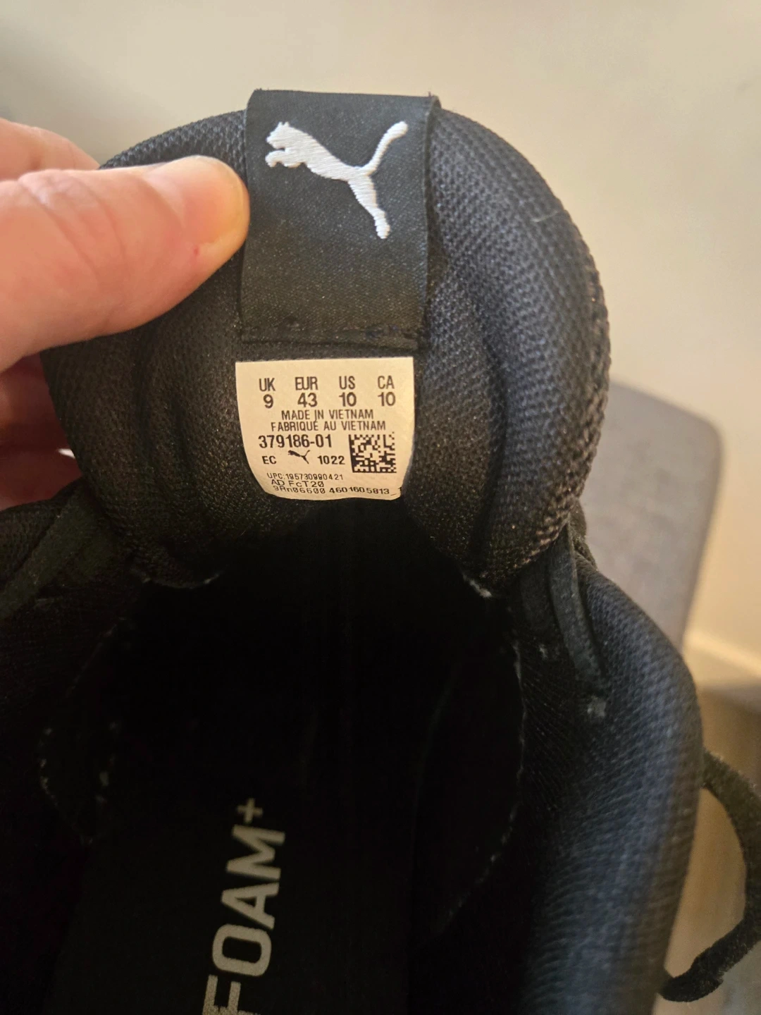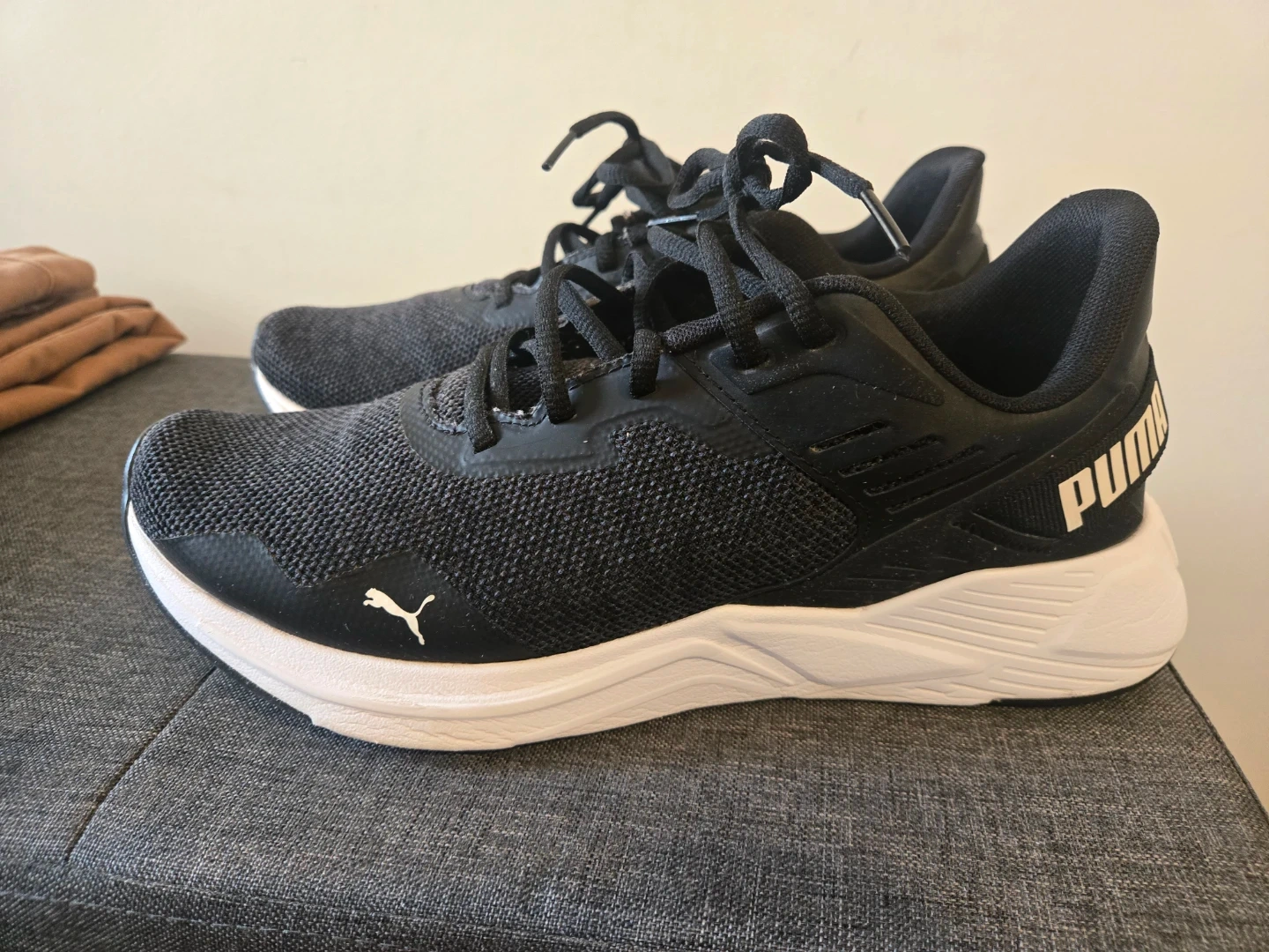 These are black Puma running shoes in a men's size 10 US. They're made with a mesh upper and a white sole.