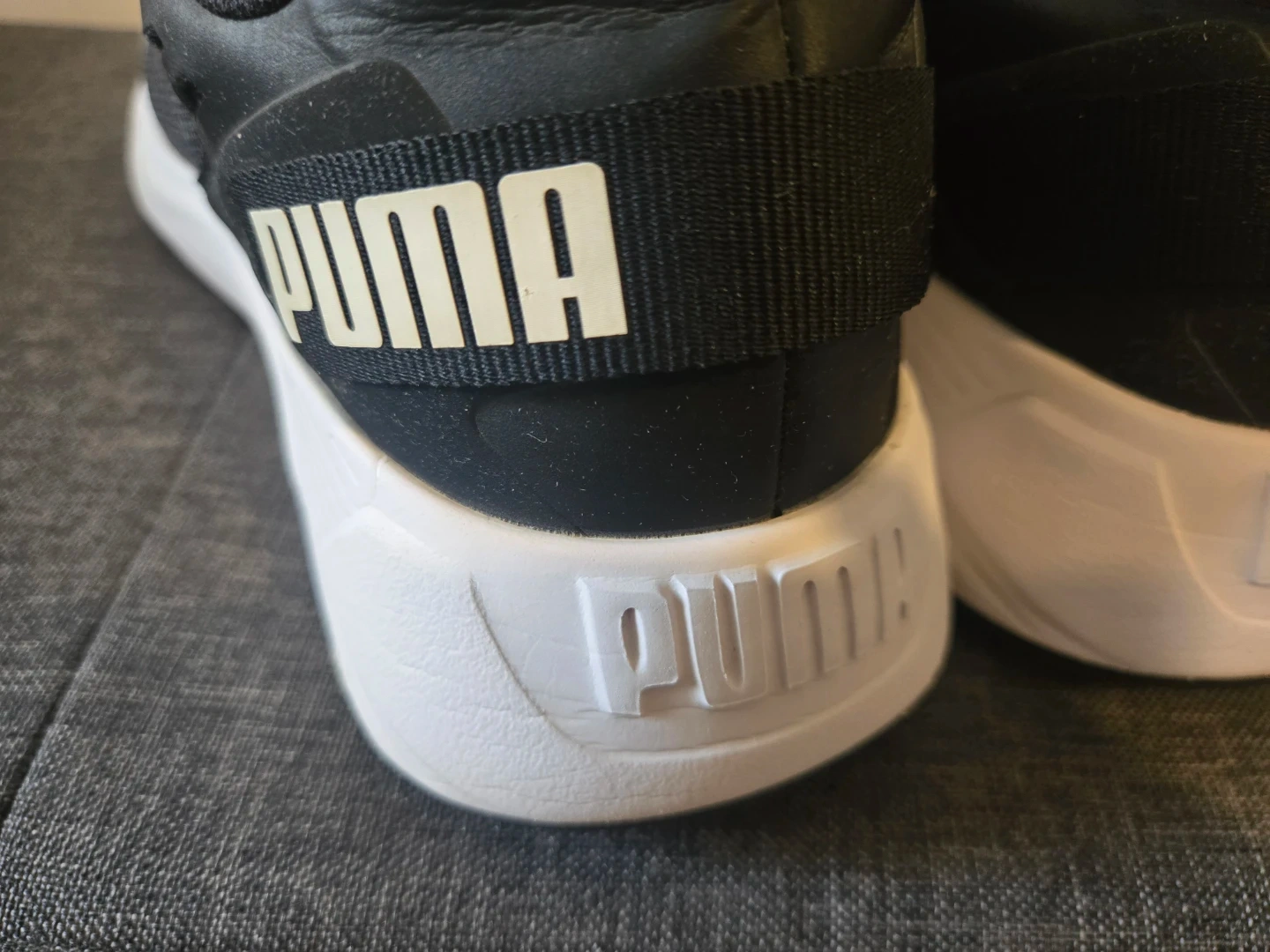 These are black Puma running shoes in a men's size 10 US. They're made with a mesh upper and a white sole.