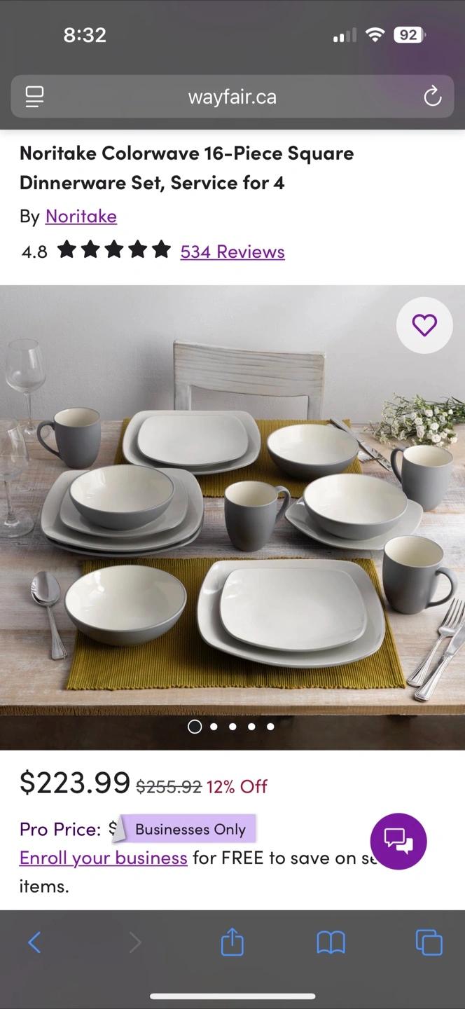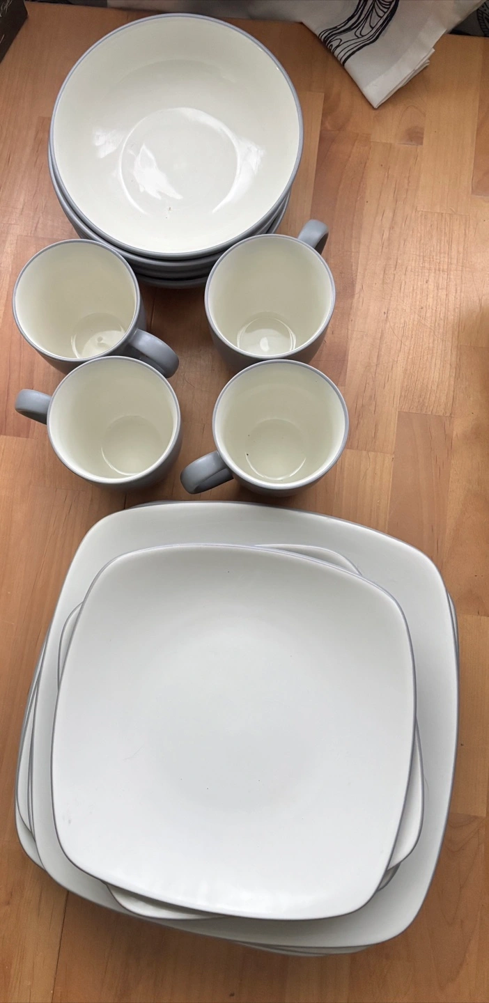 Selling a Noritake Colorwave 16-piece dinnerware set in the slate colour! This set is service for 4 and includes square dinner plates, side plates, bowls, and mugs. It's microwave and oven safe, made of stoneware. A stylish addition to any dining table! Sells for $250+ asking $150. Still is great condition, no chips or marks.