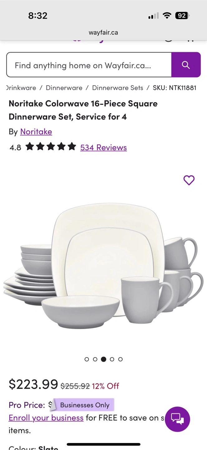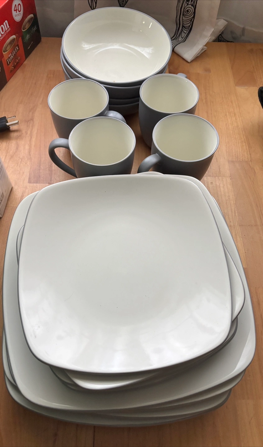 Selling a Noritake Colorwave 16-piece dinnerware set in the slate colour! This set is service for 4 and includes square dinner plates, side plates, bowls, and mugs. It's microwave and oven safe, made of stoneware. A stylish addition to any dining table! Sells for $250+ asking $150. Still is great condition, no chips or marks.