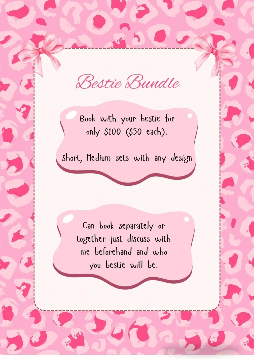 Book a nail appointment with your bestie for only $100 ($50 each)! This deal includes short and medium sets with any design. You can also book separately, just discuss beforehand who your bestie will be