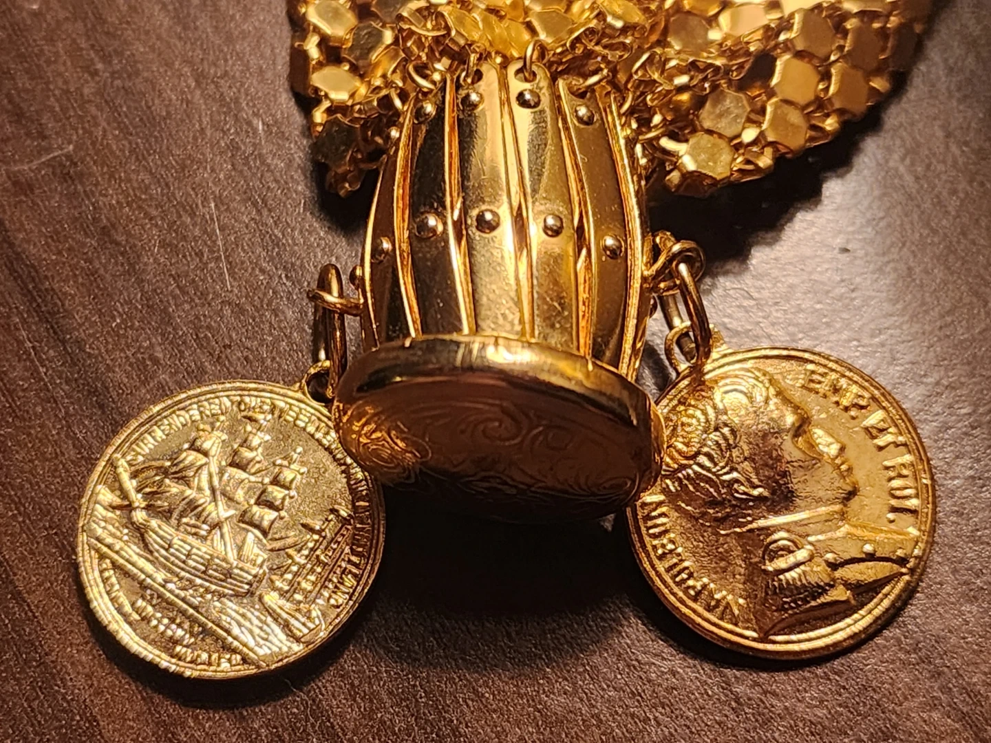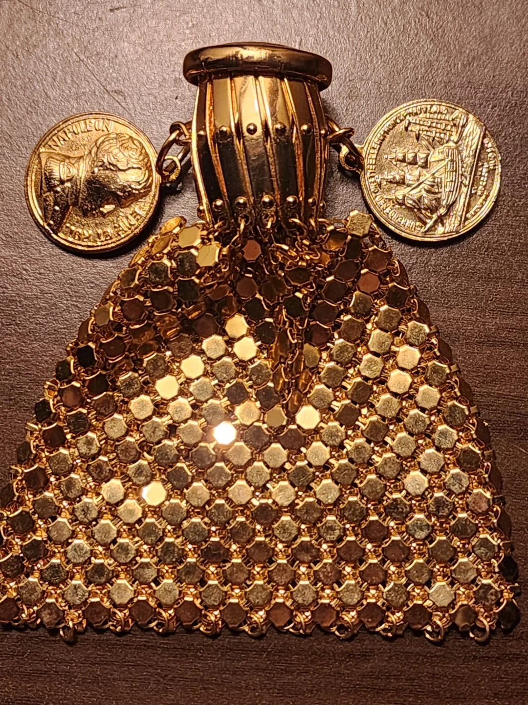 This is a vintage gold-tone mesh expandable coin purse, often referred to as a "beggar's bag" or "gate-top" purse, dating back to the Art Deco era, possibly the 1920s to 1950s. It features a distinctive metal mesh body and a functional gate-top mechanism that allows the opening to expand and contract like an accordion. This specific model includes two decorative coins attached to the frame: one featuring a portrait of Napoleon and the other depicting the Rhode Island ship.