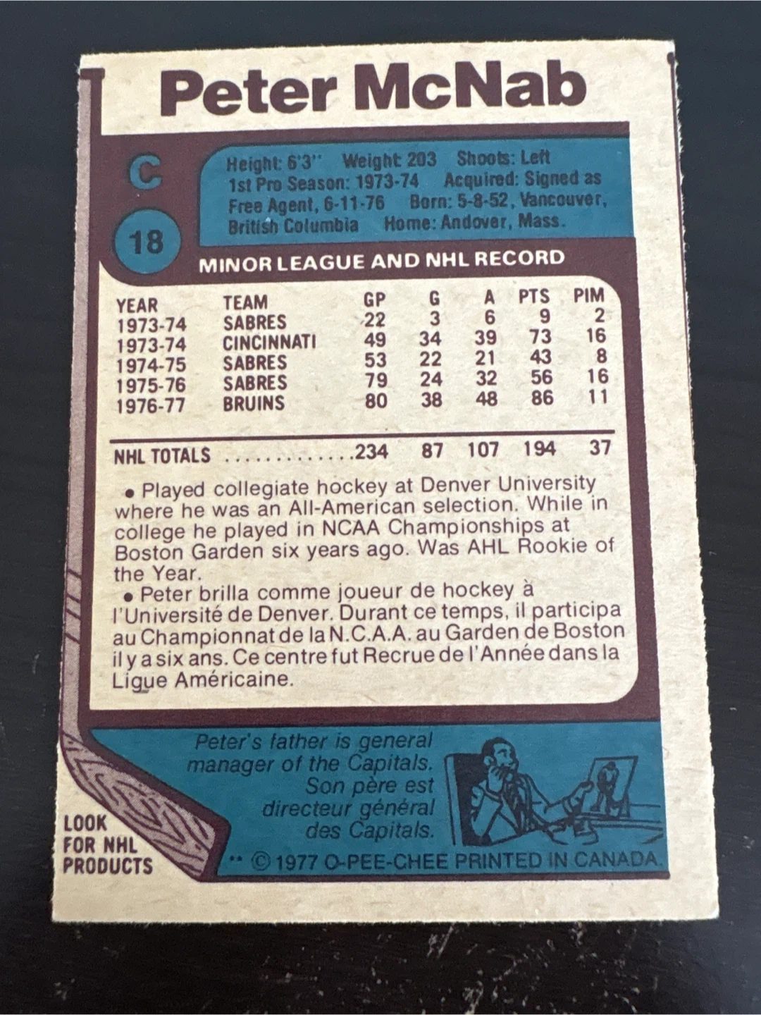This is a 1977 O-Pee-Chee Peter McNab hockey card featuring the Boston Bruins player. The card includes his career statistics and biographical information. Printed in Canada.