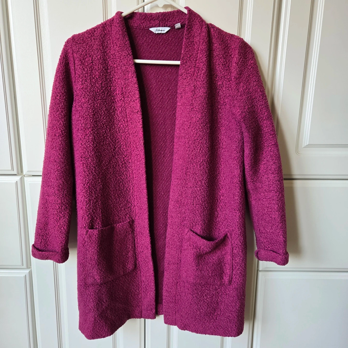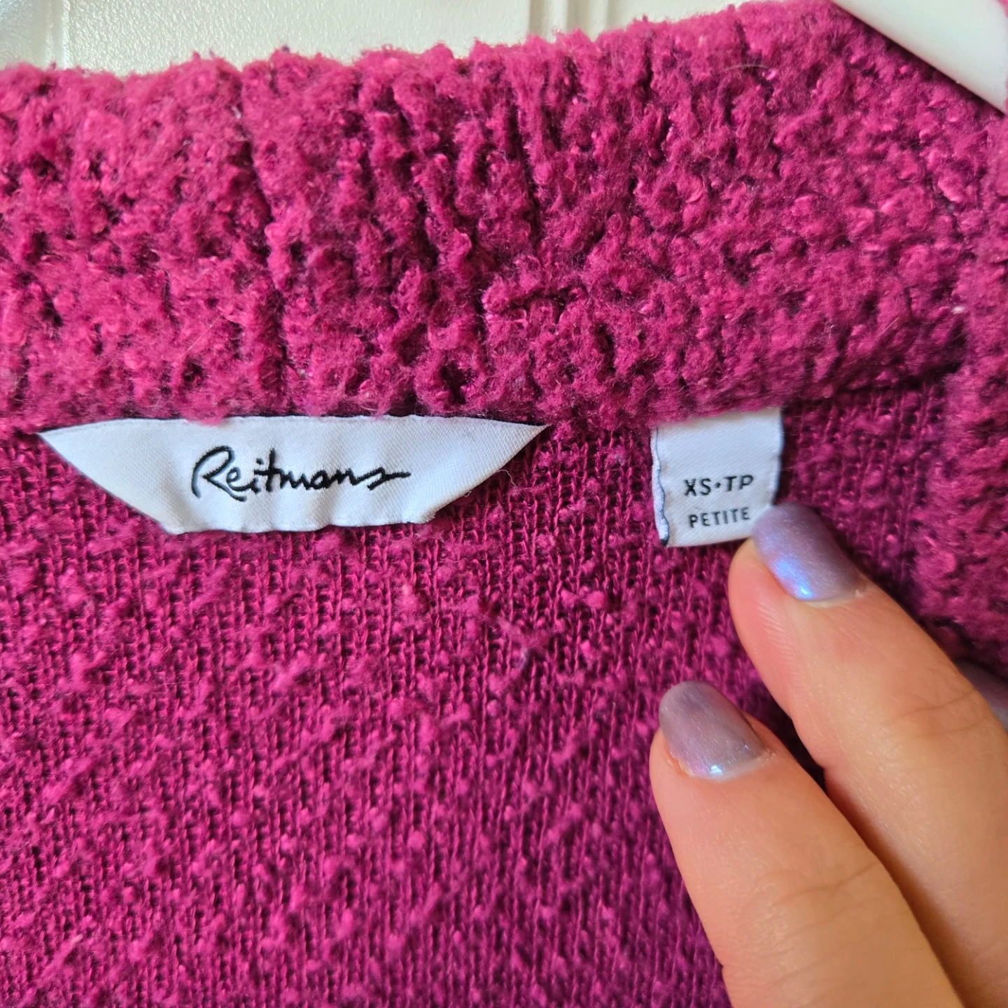 This Reitmans cardigan is a vibrant magenta colour and features pockets. Made from 95% viscose and 5% elastane for the body, with 100% polyester sleeves and yoke. Perfect for layering during cooler weather!