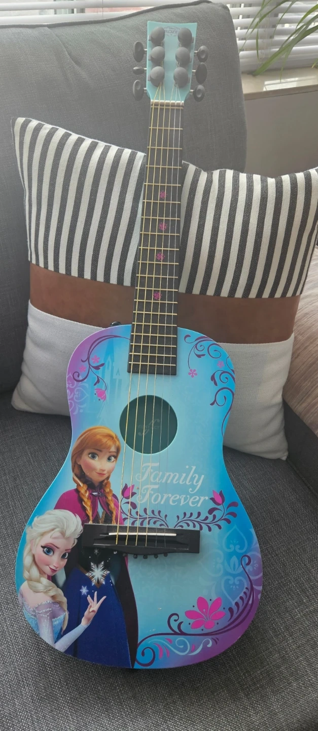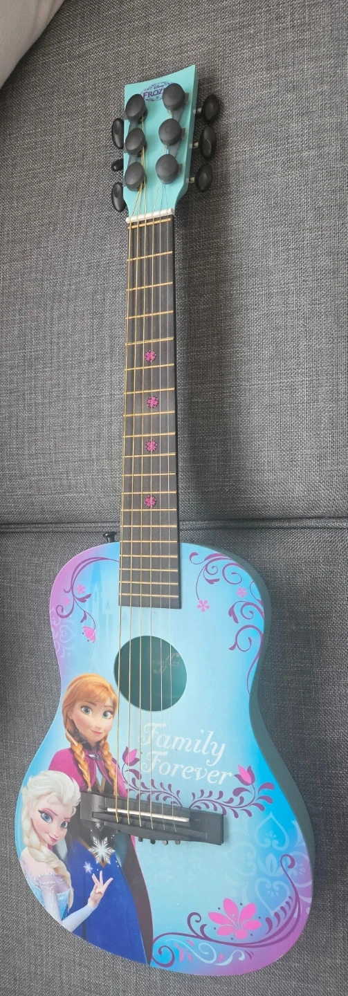 This is a kid's acoustic guitar featuring characters from Disney's Frozen. It has a fun, colourful design with Anna and Elsa. It's great for young aspiring musicians to start learning on!