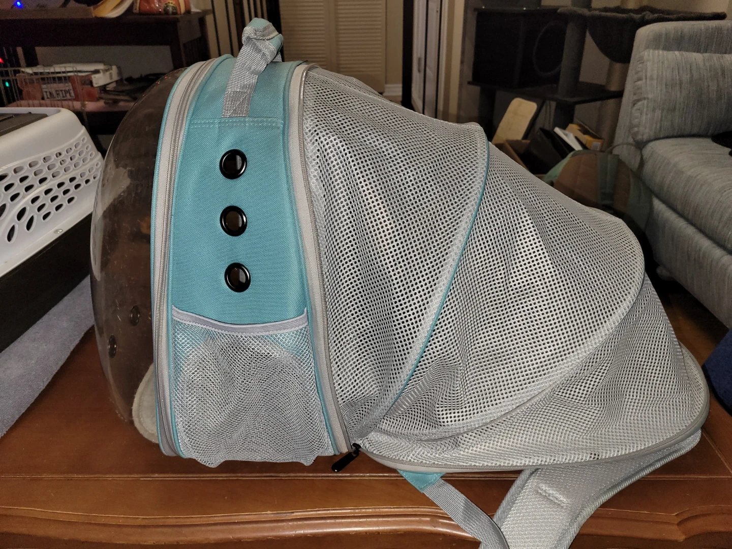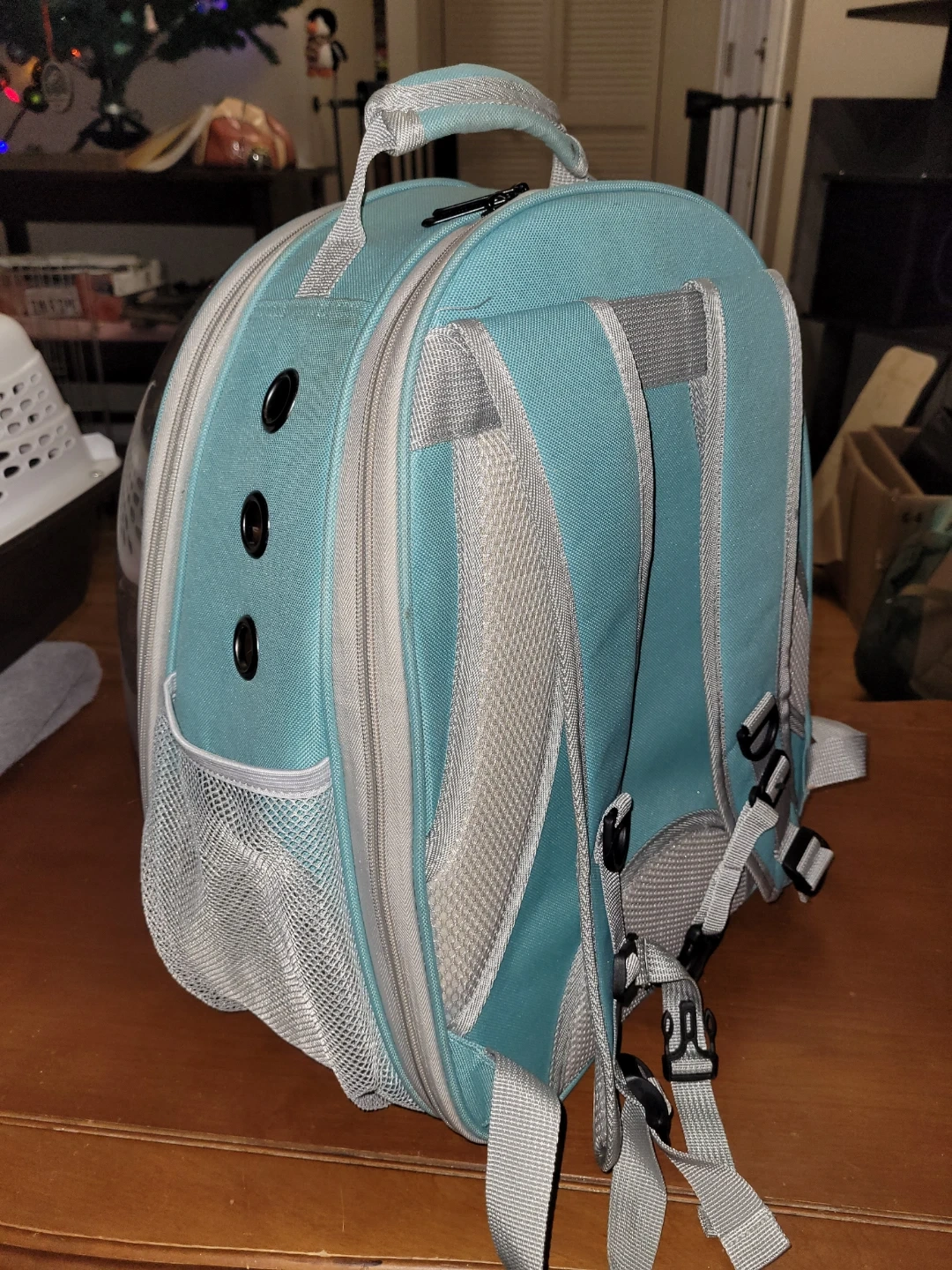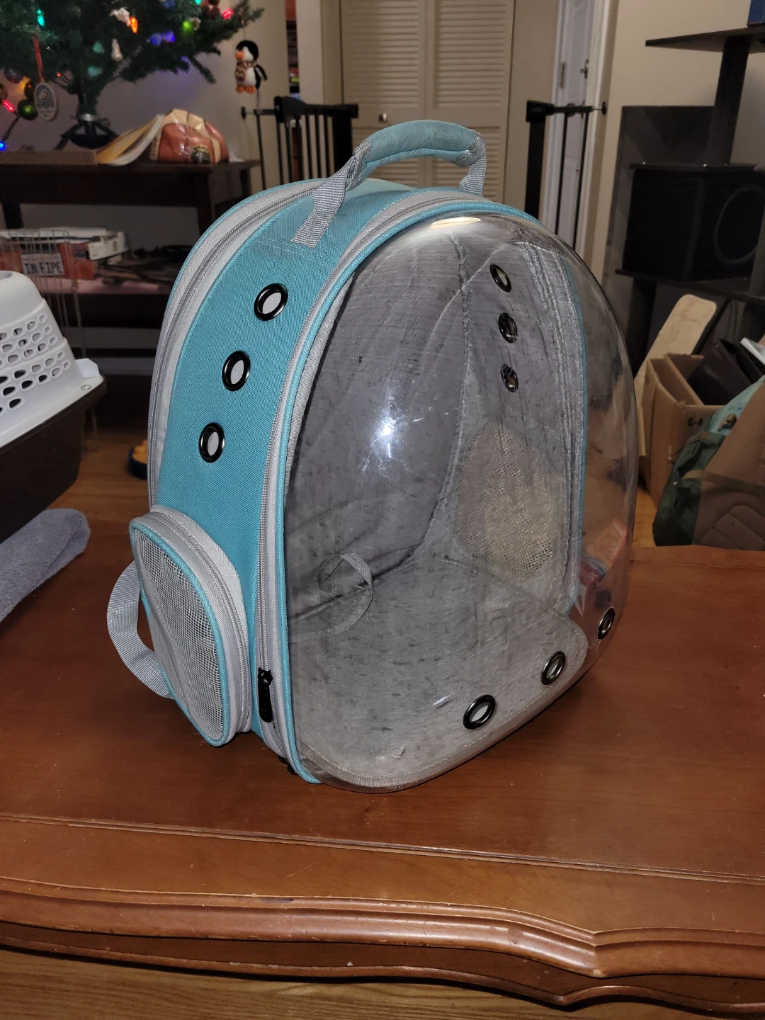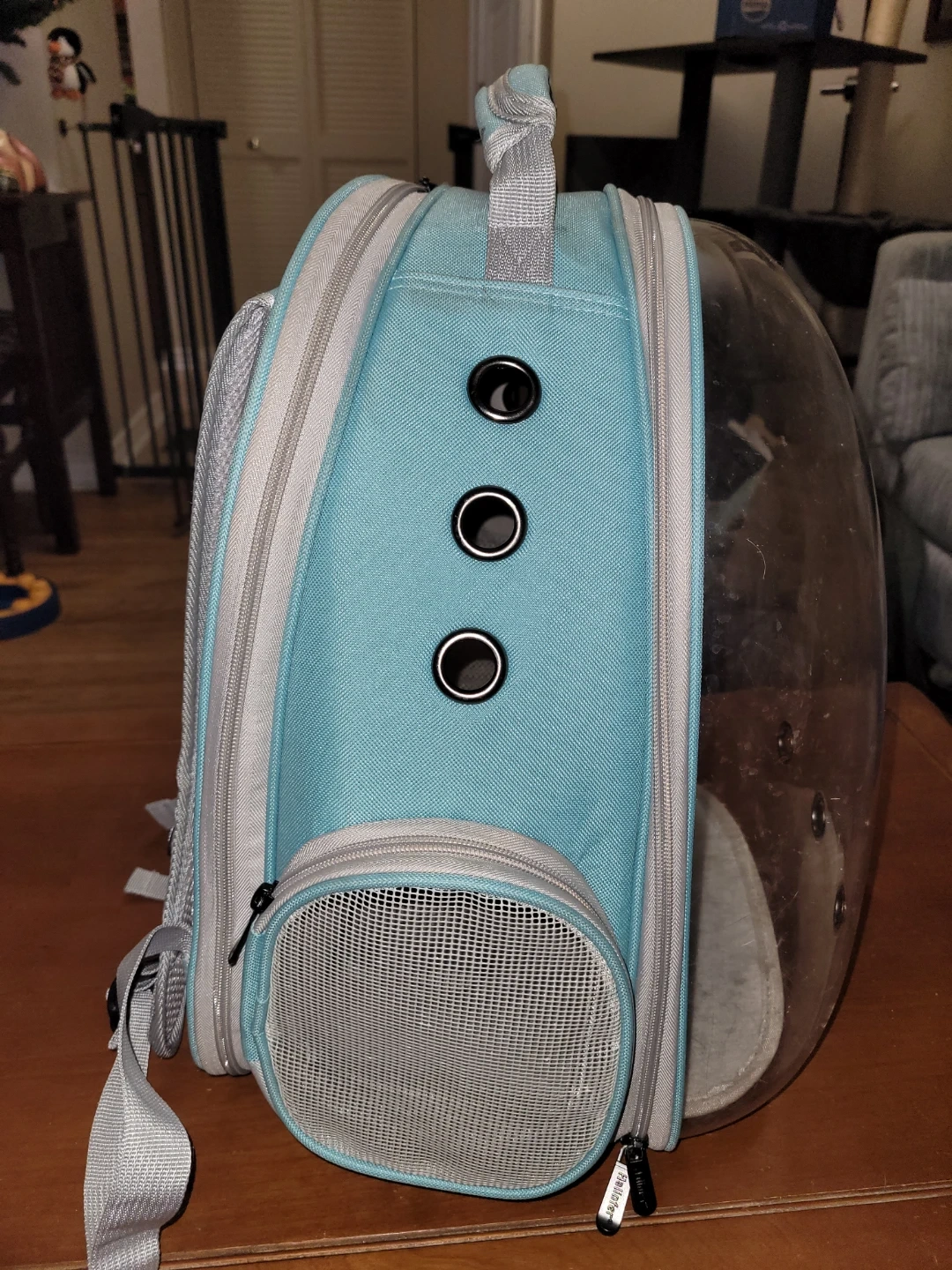 This pet carrier backpack features a clear bubble dome for your pet to see out. It has ventilation holes and two ways to access your pet. The backpack has adjustable straps.