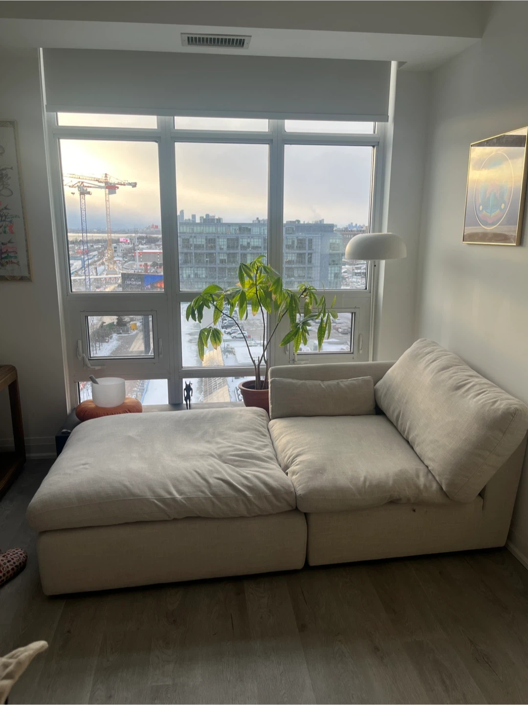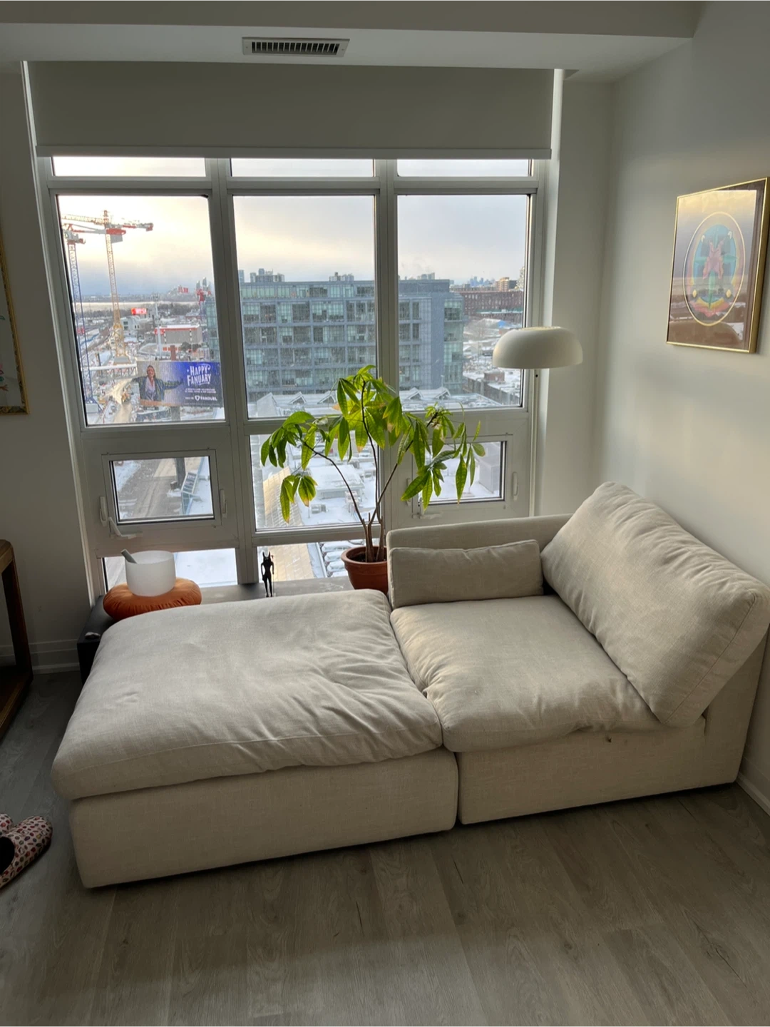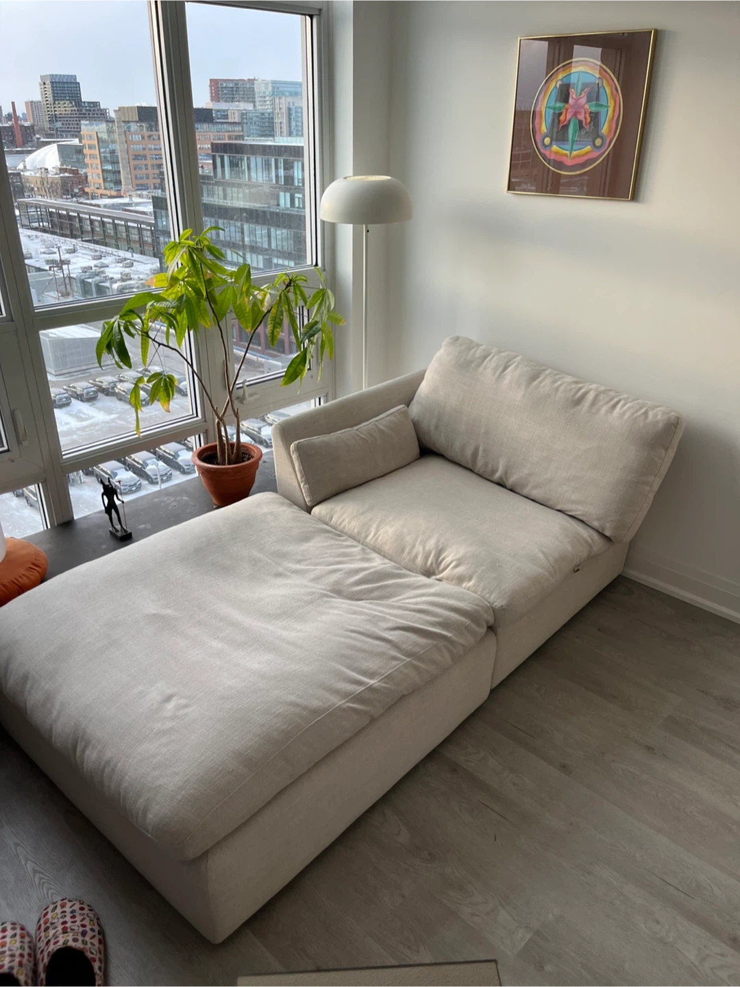 This comfy sectional style sofa features a two modulars that can be a couch or chaise, depending on how you place one of them. It's upholstered in a neutral, light-coloured fabric that complements most decor. The modular design makes it easy to arrange in various spaces. Great for relaxing or entertaining guests! SUPER COMFY. Smoke free and pet free. Each modular is 40 x 40 and 15 high (base + pillow) Pickup on in Liberty Village. Doesn’t need a service elevator and easy to carry with one or two people.