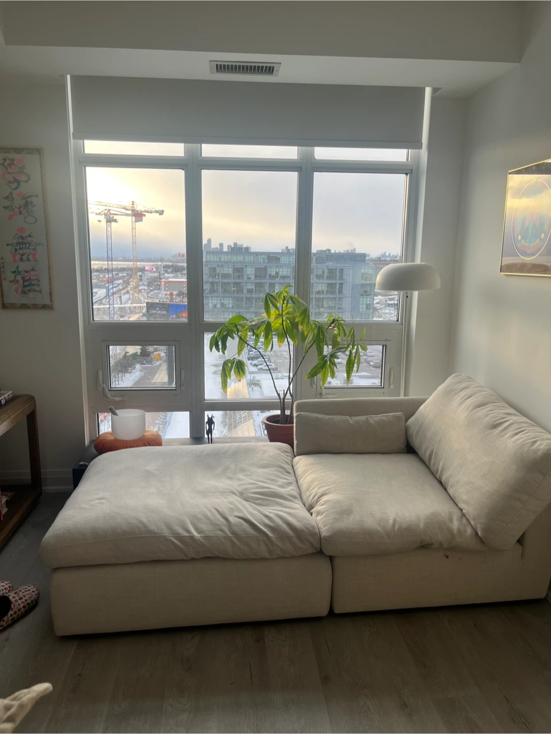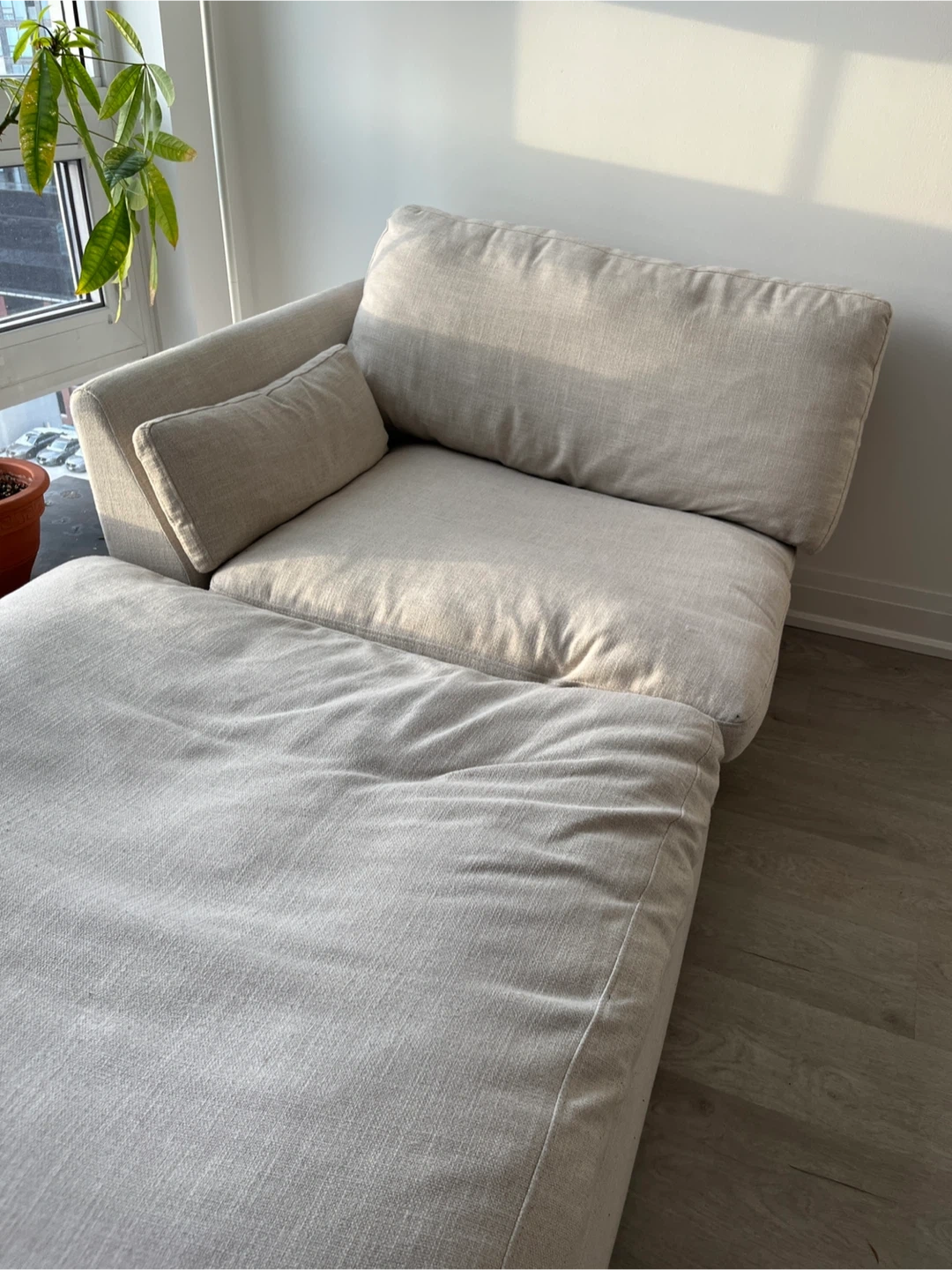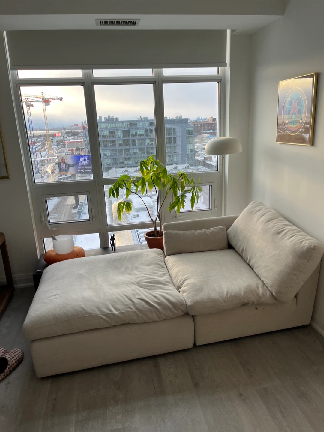 This comfy sectional style sofa features a two modulars that can be a couch or chaise, depending on how you place one of them. It's upholstered in a neutral, light-coloured fabric that complements most decor. The modular design makes it easy to arrange in various spaces. Great for relaxing or entertaining guests! SUPER COMFY. Smoke free and pet free. Each modular is 40 x 40 and 15 high (base + pillow) Pickup on in Liberty Village. Doesn’t need a service elevator and easy to carry with one or two people.