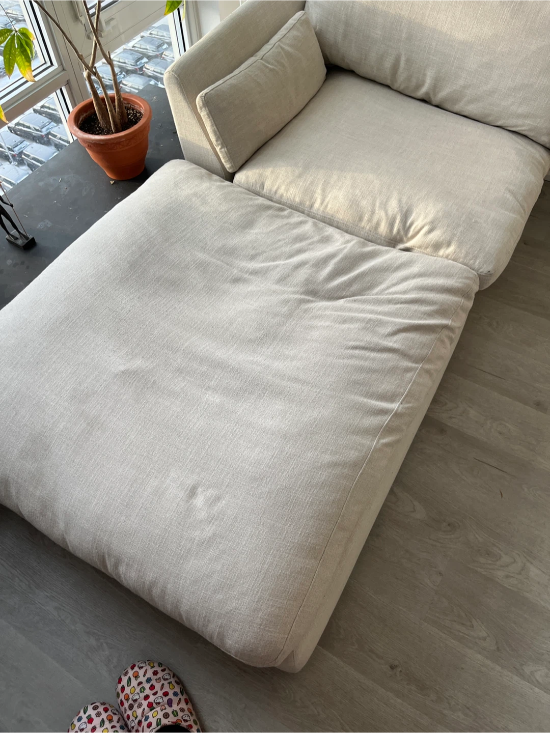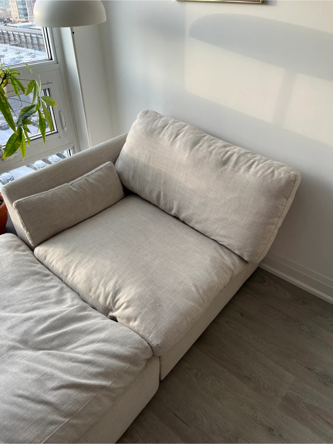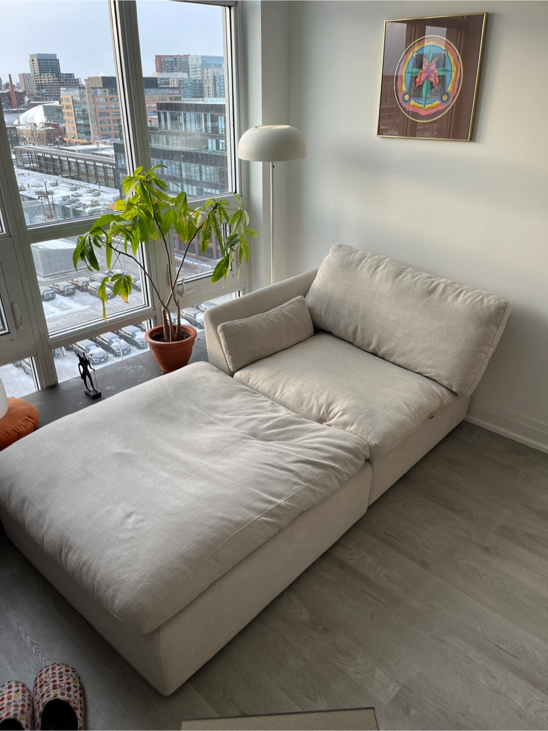 This comfy sectional style sofa features a two modulars that can be a couch or chaise, depending on how you place one of them. It's upholstered in a neutral, light-coloured fabric that complements most decor. The modular design makes it easy to arrange in various spaces. Great for relaxing or entertaining guests! SUPER COMFY. Smoke free and pet free. Each modular is 40 x 40 and 15 high (base + pillow) Pickup on in Liberty Village. Doesn’t need a service elevator and easy to carry with one or two people.