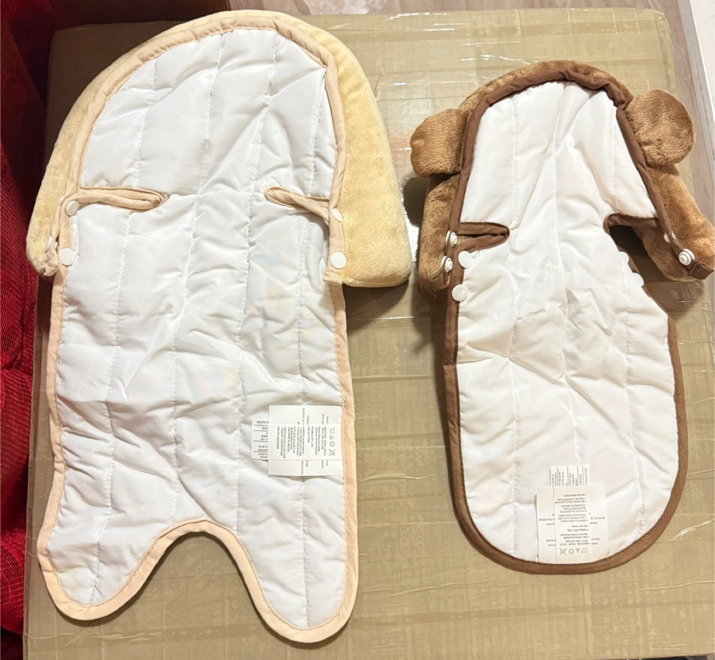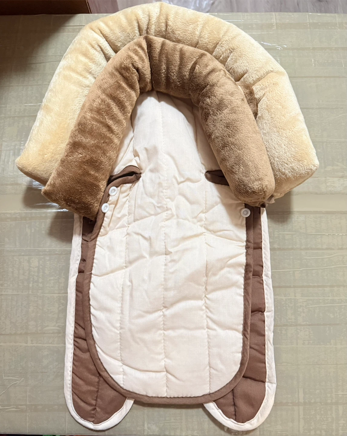 Two padded inserts for baby comfort and head support. One is a lighter beige and tan, the other is a darker brown and tan. Both feature plush trim for coziness. These are great for strollers and car seats!