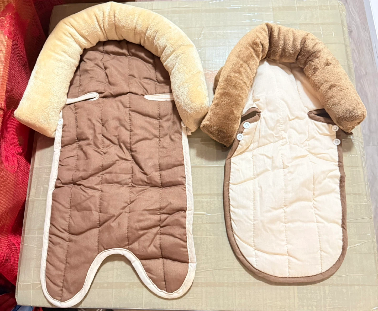 Two padded inserts for baby comfort and head support. One is a lighter beige and tan, the other is a darker brown and tan. Both feature plush trim for coziness. These are great for strollers and car seats!