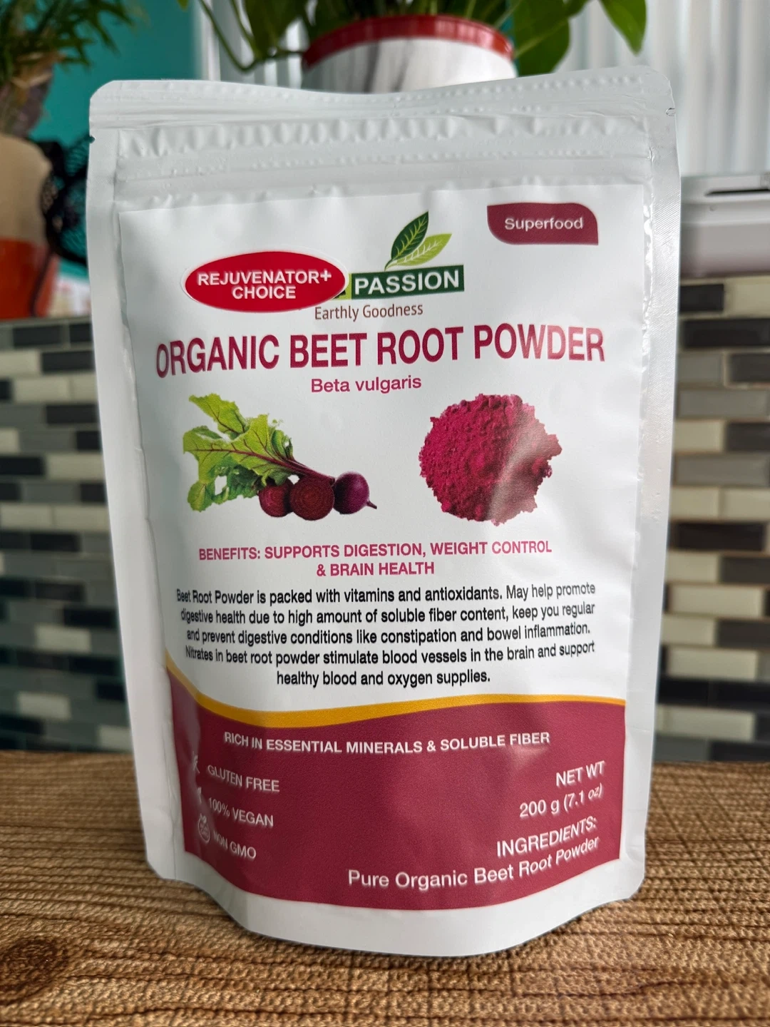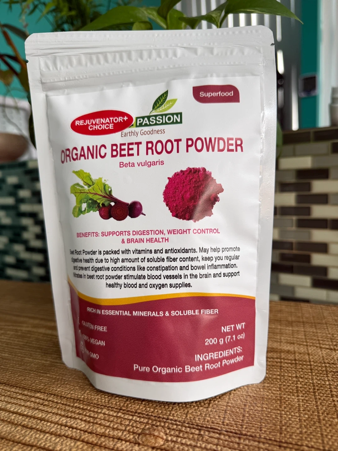 This is organic beet root powder, packed with vitamins and antioxidants. It's gluten-free, 100% vegan, and non-GMO. Net weight is 200g (7.1 oz).