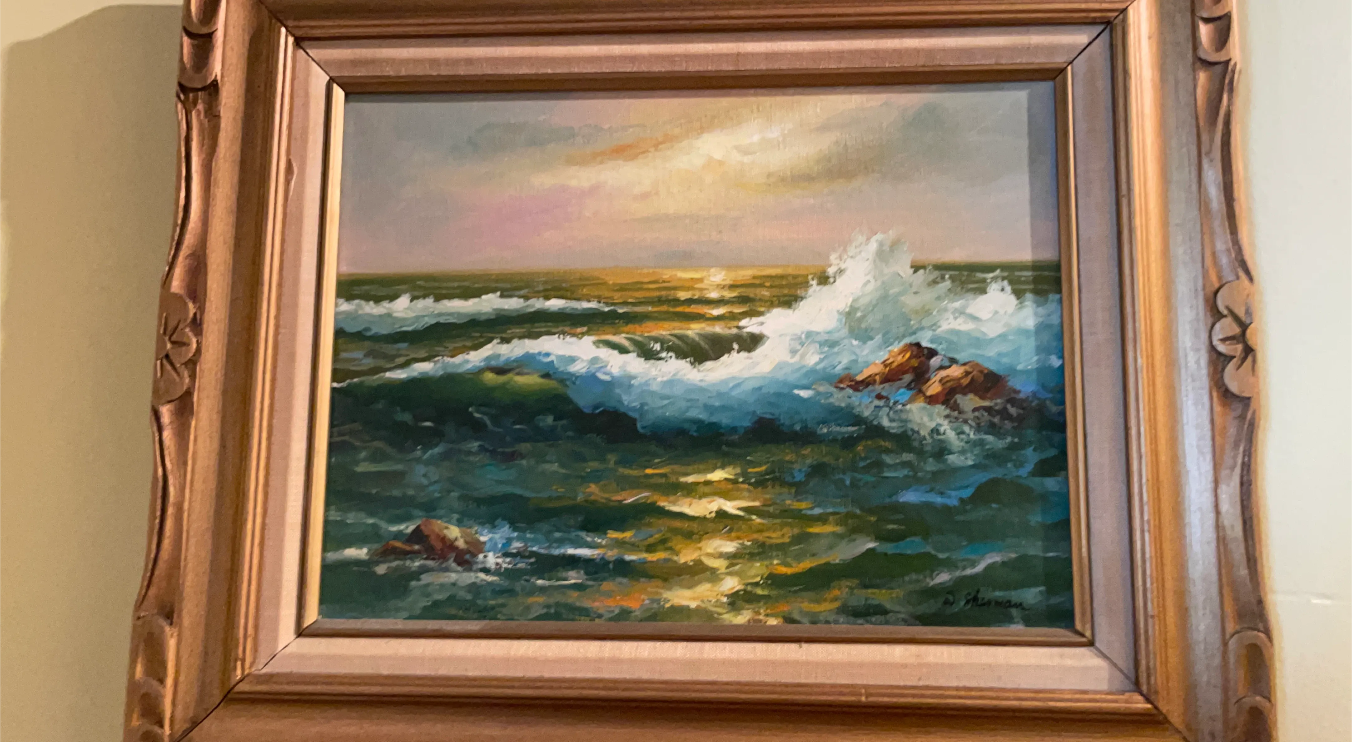 This is a beautiful framed painting of ocean waves crashing against rocks. The frame is ornate and complements the painting well. It would look great in any room!