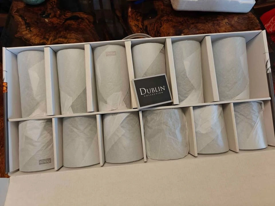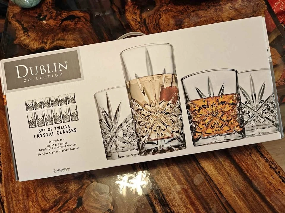 Brand new Dublin Collection crystal glass set. Never used, still in original box with protective packaging. Includes: 6 Double Old Fashioned glasses (11oz), 6 Highball glasses (12oz). Perfect for whiskey, cocktails, juice, or gifts. Elegant crystal design. Pretty heavy with a solid build. All perfect. Still in original packaging. Great as a gift for housewarming, wedding, or holidays. Price is firm.