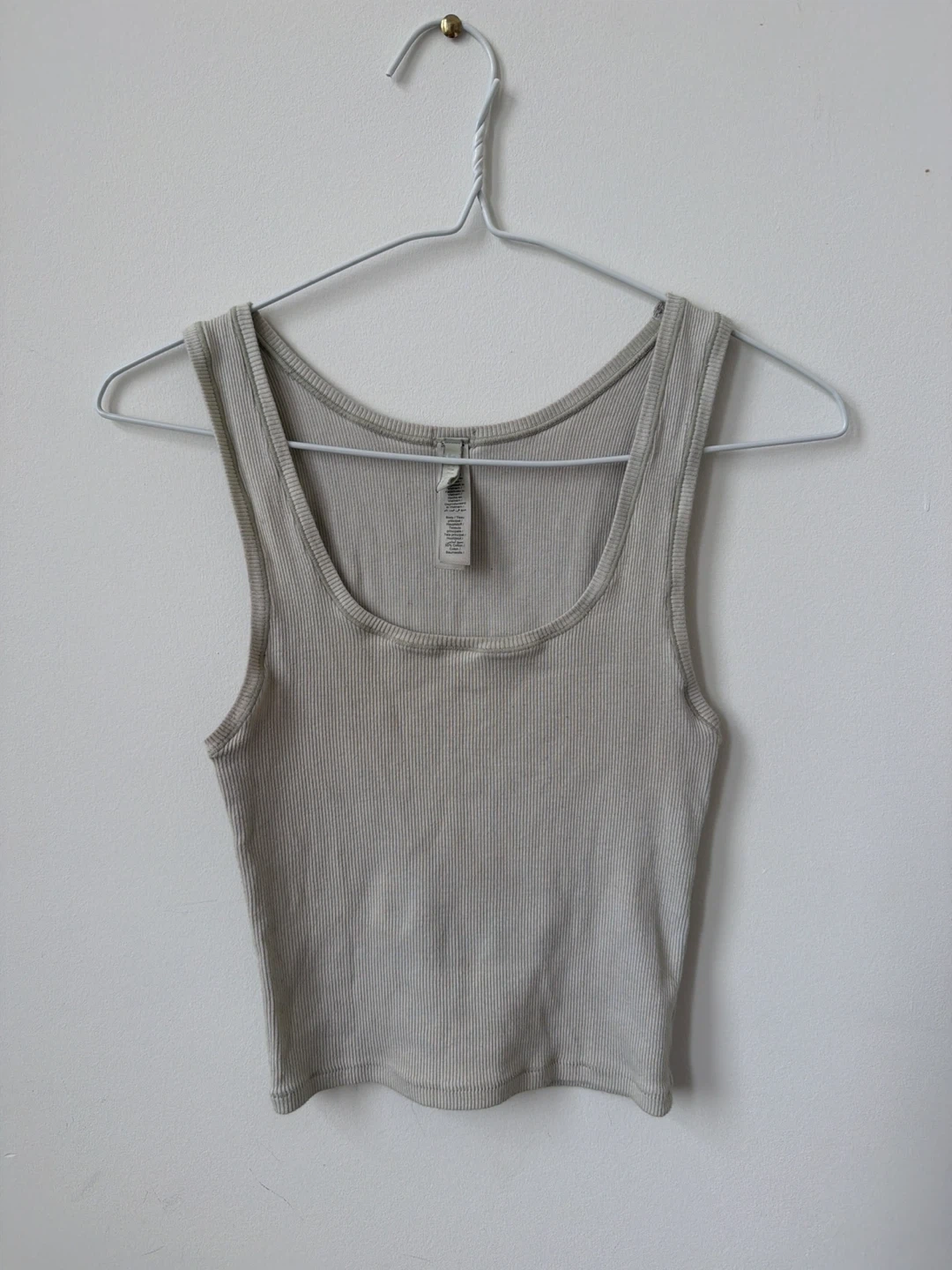 A light grey ribbed tank top. Made with 95% cotton. A classic basic for layering or wear on its own. has been worn maybe twice.