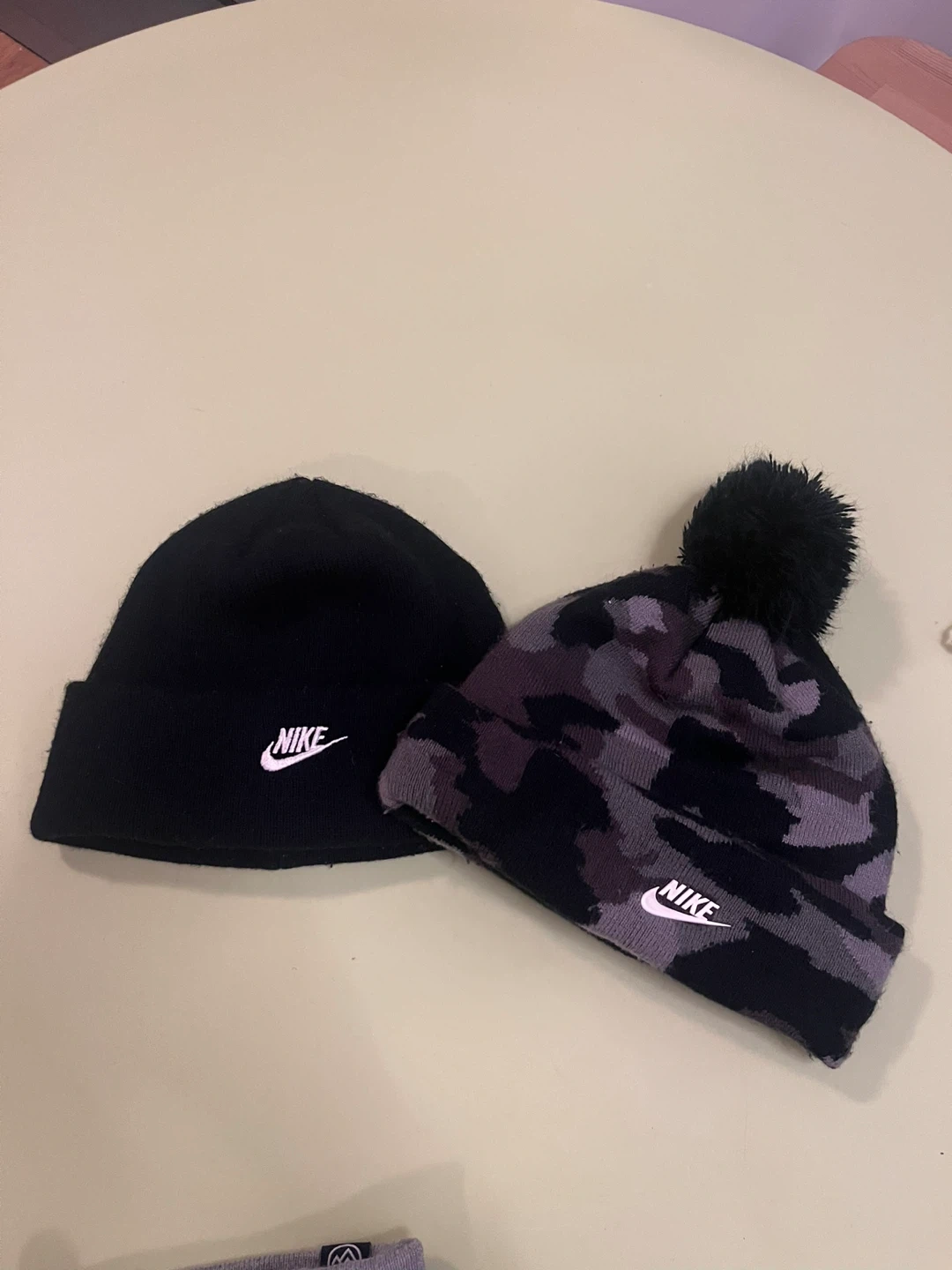 Selling two Nike youth beanie hats! One is a solid black colour, and the other has a cool camo pattern. Both are in great condition