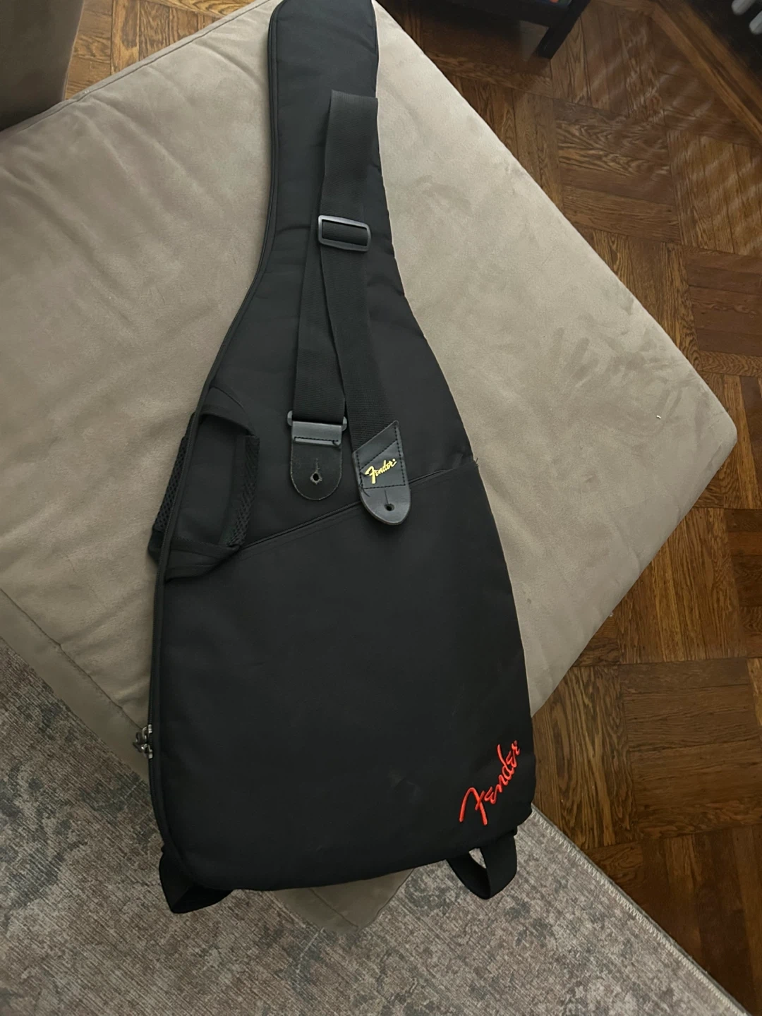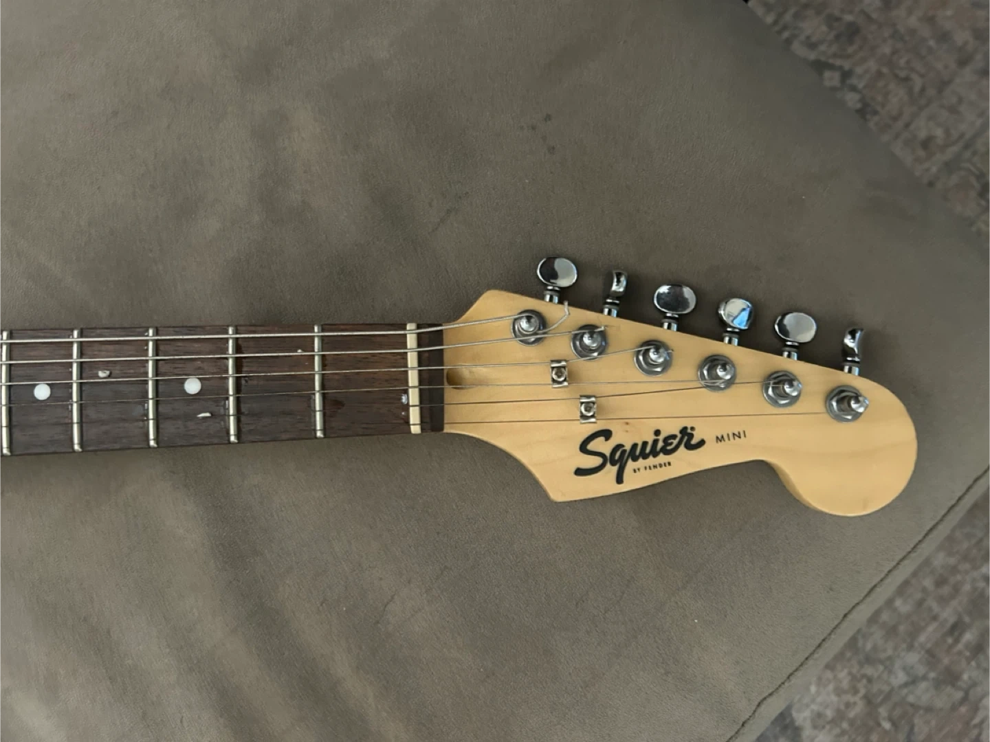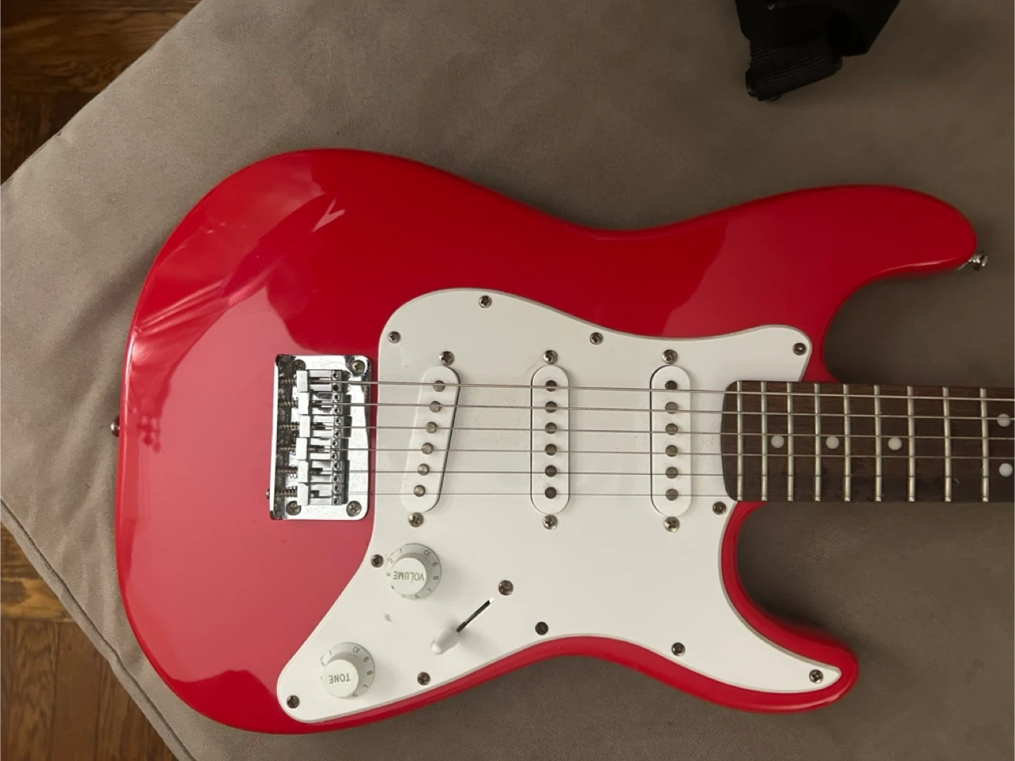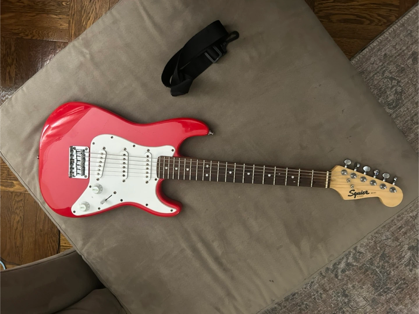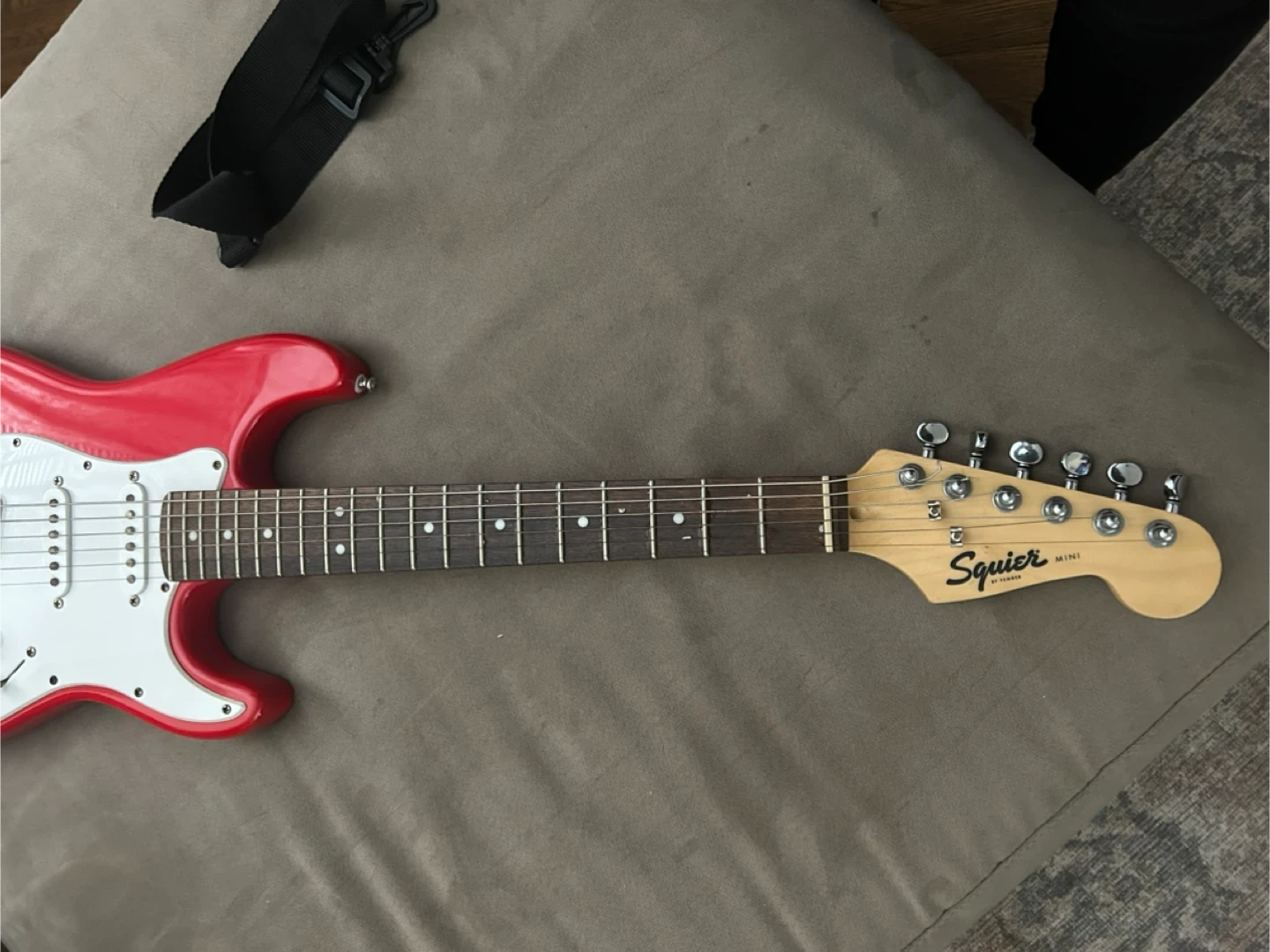 This is a red Squier Mini Stratocaster electric guitar. It's a short-scale guitar, perfect for younger players or those with smaller hands. Includes a Fender gig bag.
