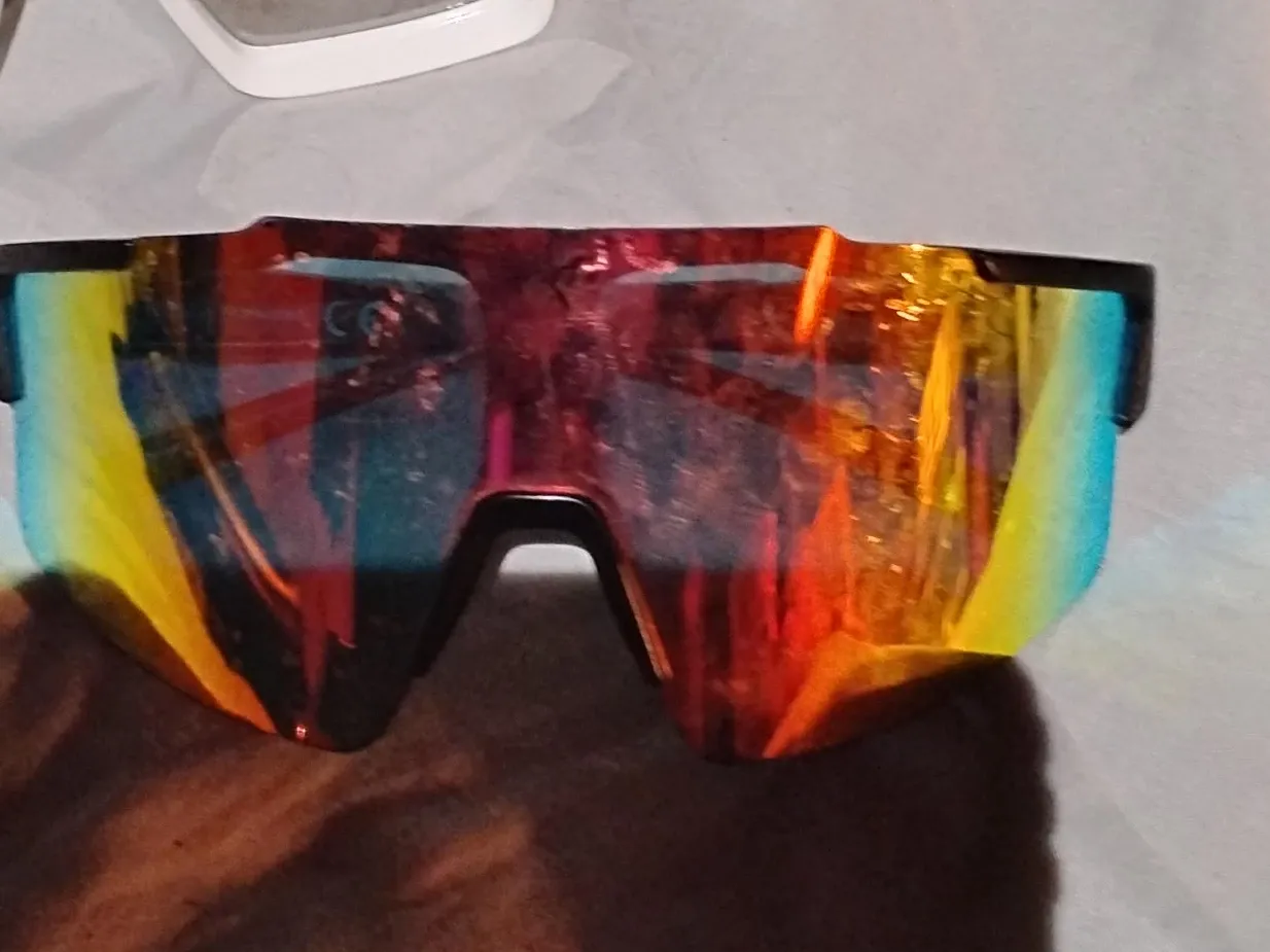 These sport sunglasses have a vibrant, multi-coloured lens. They're designed for active use with a wraparound style. Black frame with a reflective, rainbow-effect lens.