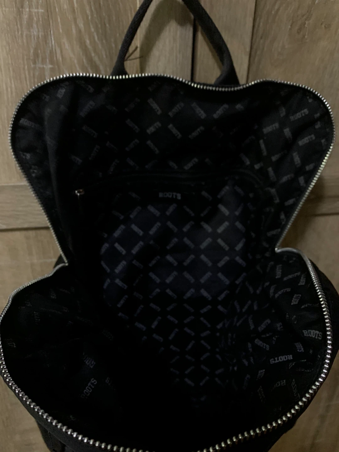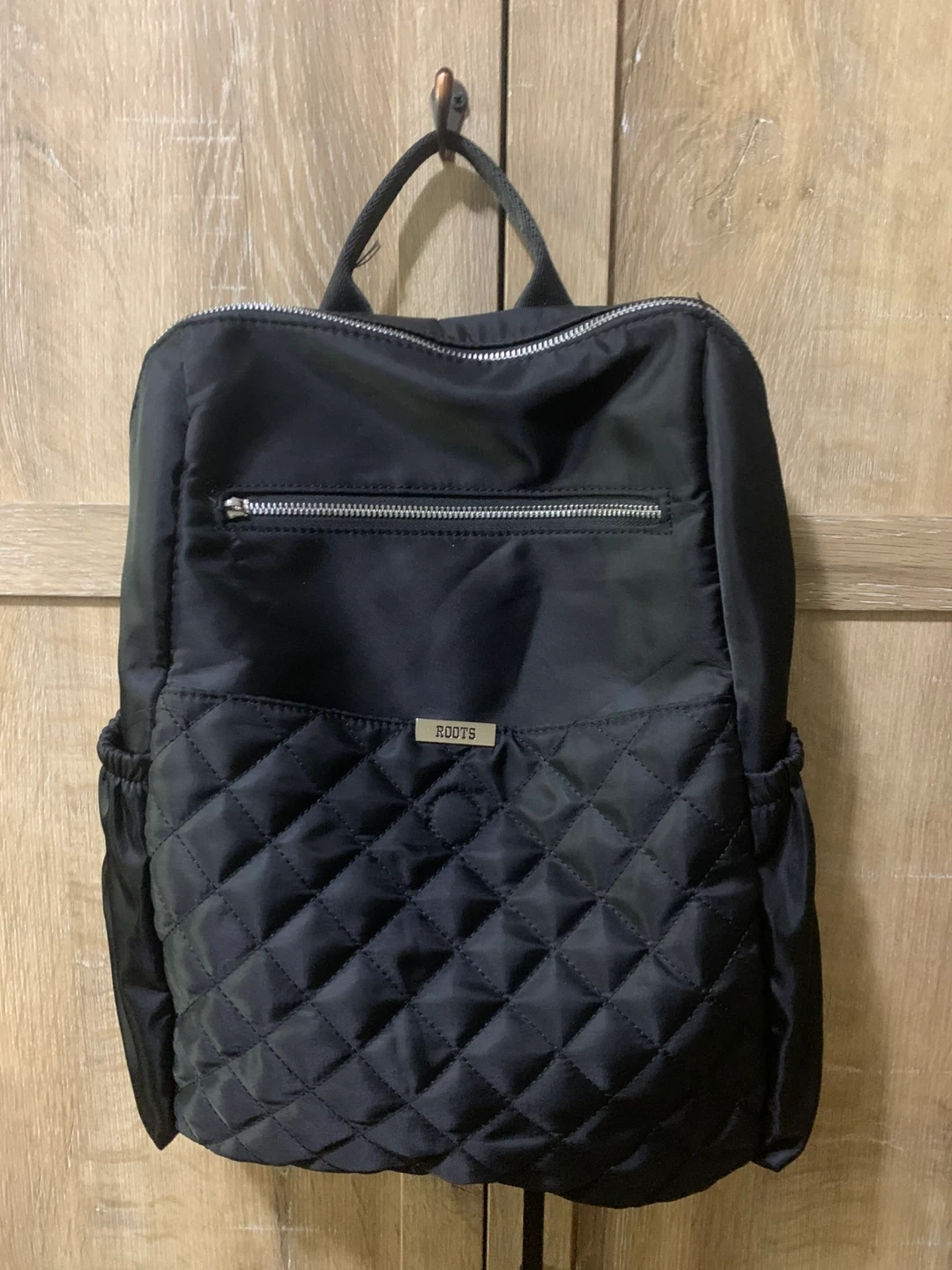This is a black Roots backpack with a quilted front pocket and silver zipper details. It has adjustable shoulder straps and a top handle. The interior lining features the Roots logo pattern. Water-resistant material.