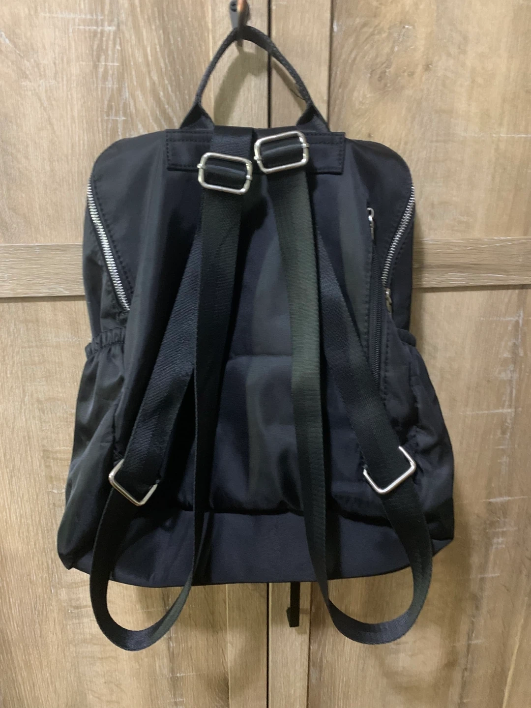 This is a black Roots backpack with a quilted front pocket and silver zipper details. It has adjustable shoulder straps and a top handle. The interior lining features the Roots logo pattern. Water-resistant material.