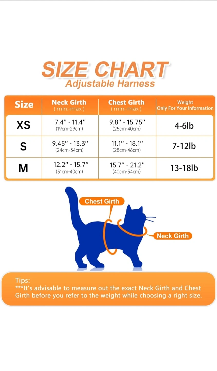 A very well made quality cat harness. Just a bit too small for my cat as he is a long boy. He only wore it once inside, which is when I deemed it too small.