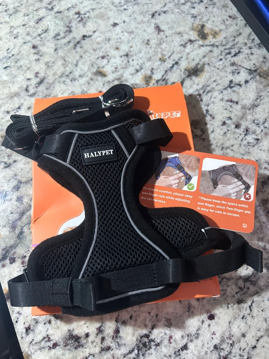 Selling a gently used Halypet cat harness in size S! It's black and comes with the leash. Please refer to the size chart in the pictures to ensure a good fit for your furry friend. It's in great condition and ready for new adventures!