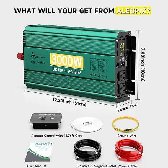 3000 Watt Inverter 12V to 110V/120V, Power Inverters for Vehicles, Car Inverter with Remote LED Display 2 AC Outlet 3.4A USB Port, Converter Inverters for Home RV Truck Solar System by ALEOPIX