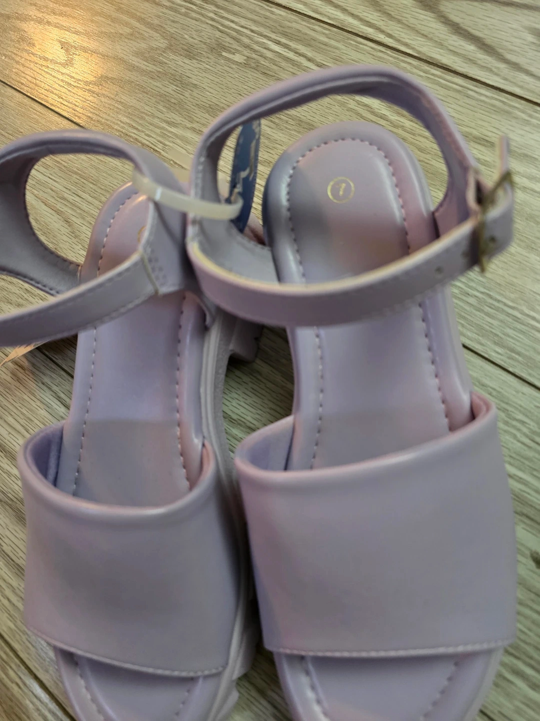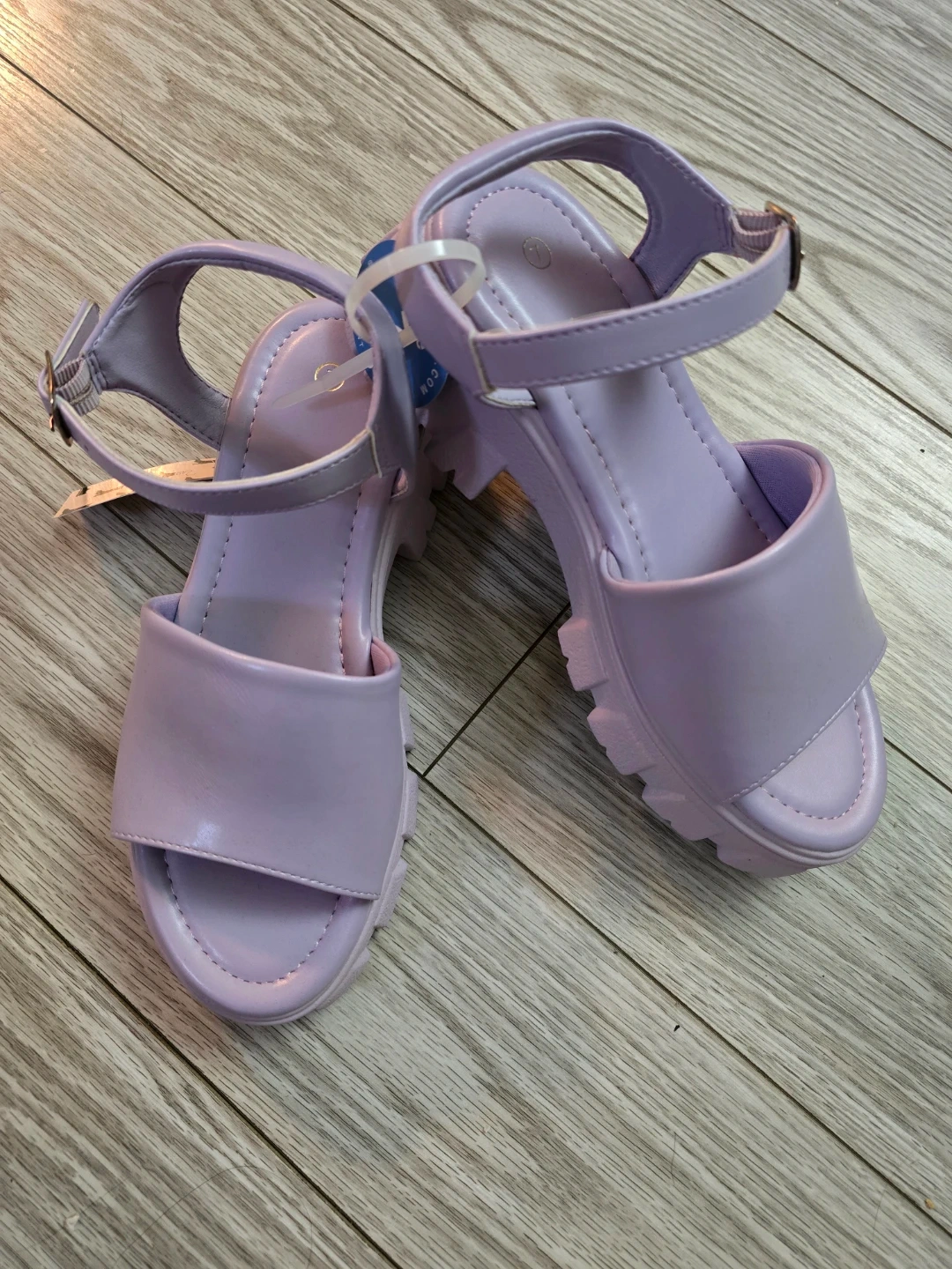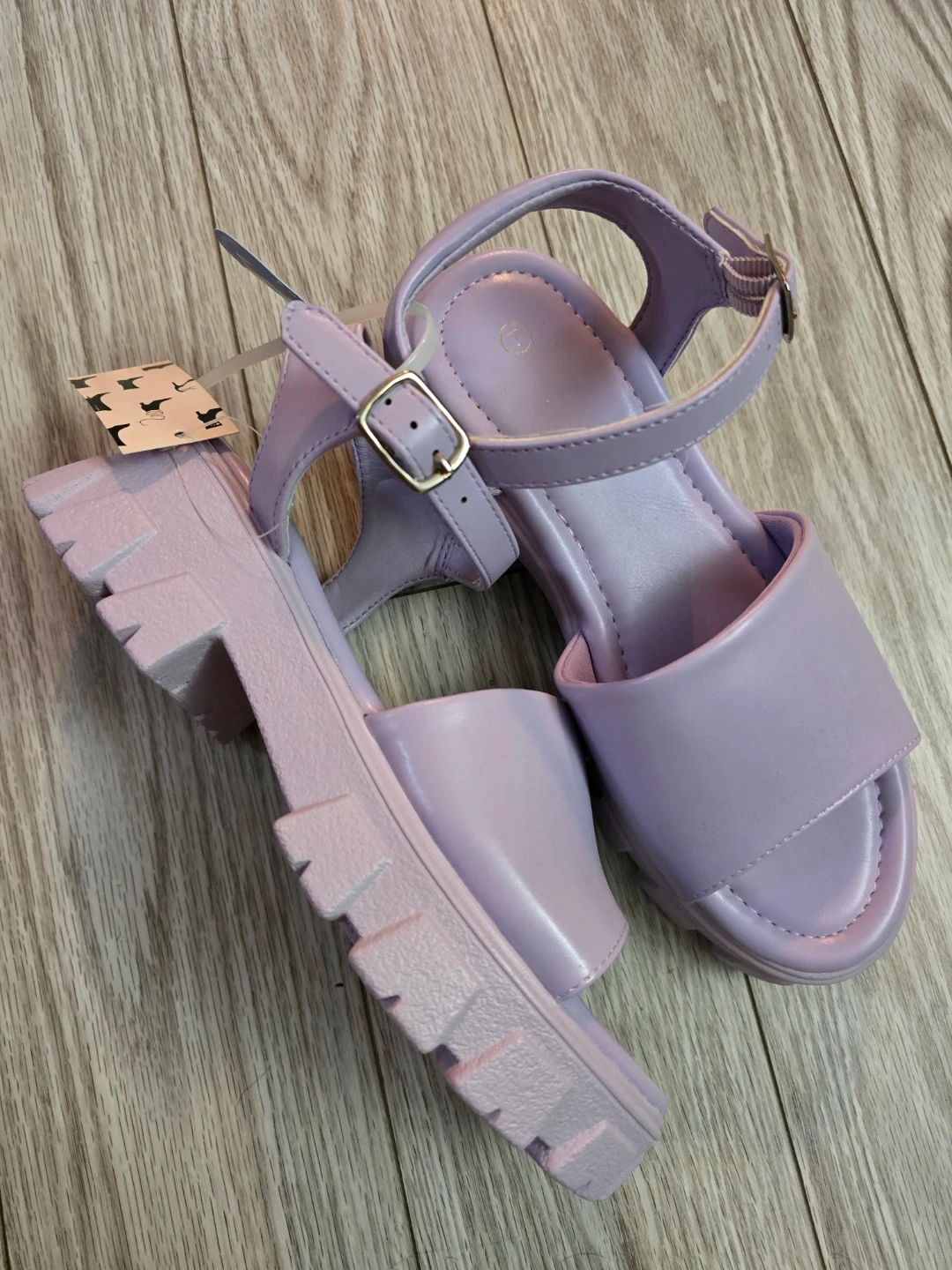These cute lilac platform sandals have a buckle closure and a sturdy lug sole. They're made with a synthetic material and feature a comfortable strap design. Soft padded comfortable to wear.