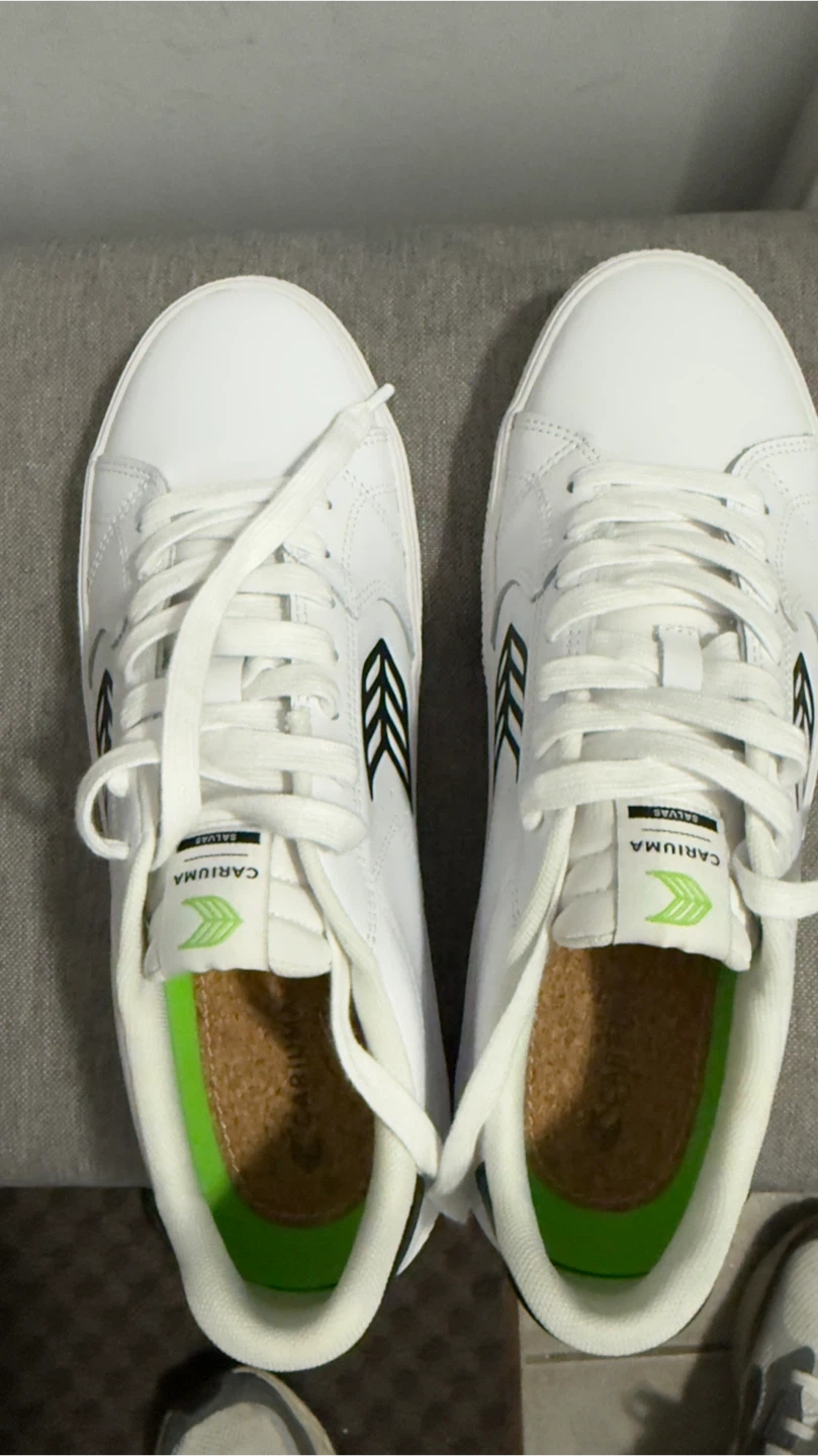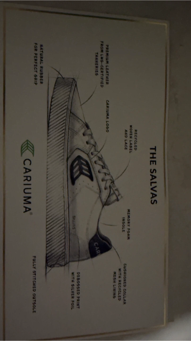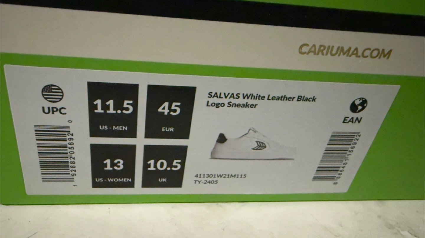 Brand New with box. Cariuma Salvas sneakers in white leather with black logos. They're a US Men's size 11.5. The shoes feature premium leather.