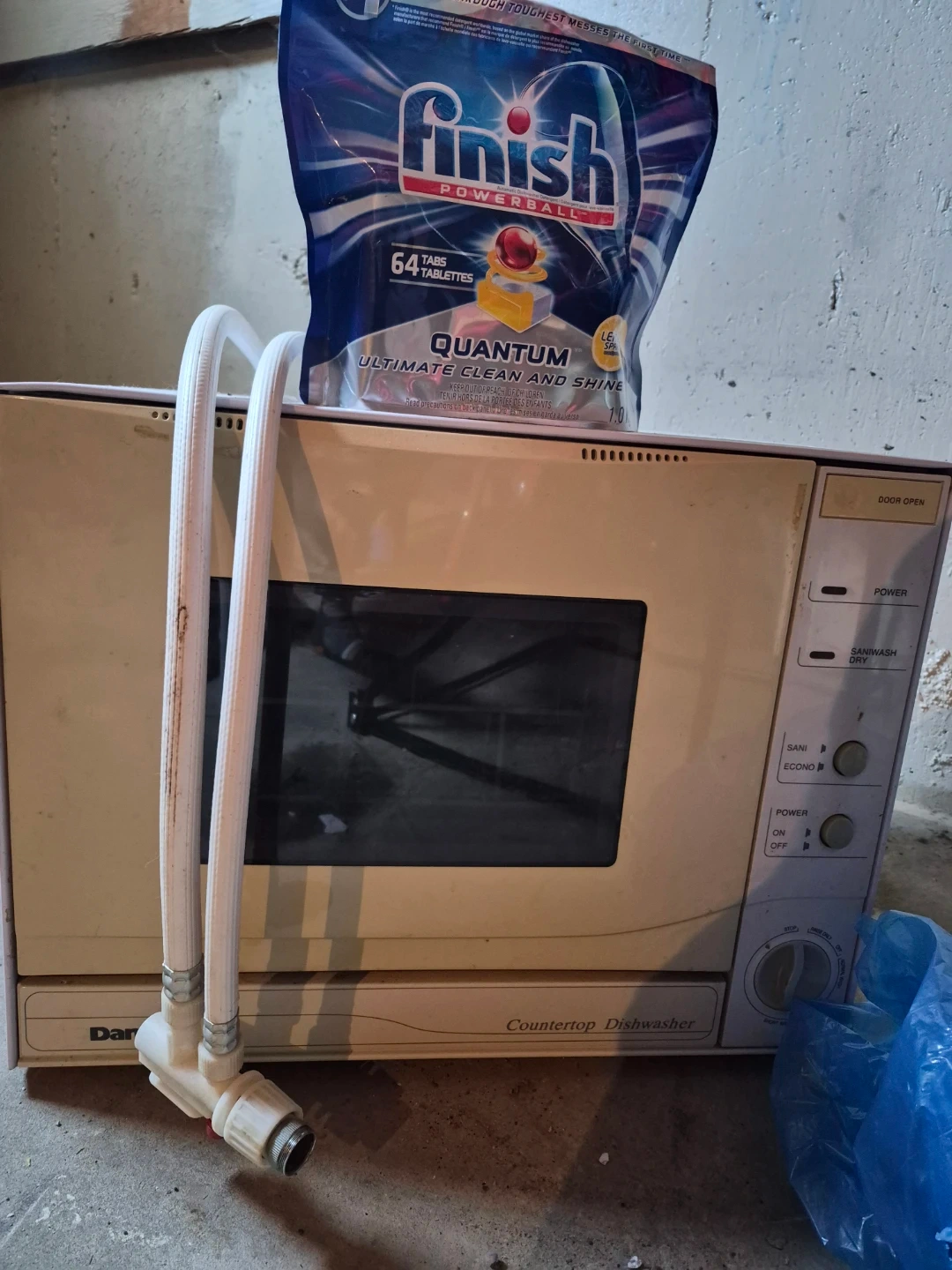 This is a Danby countertop dishwasher. It comes with a bag of 64 Finish Quantum Powerball dishwasher tabs. This dishwasher is perfect for small kitchens or apartments.