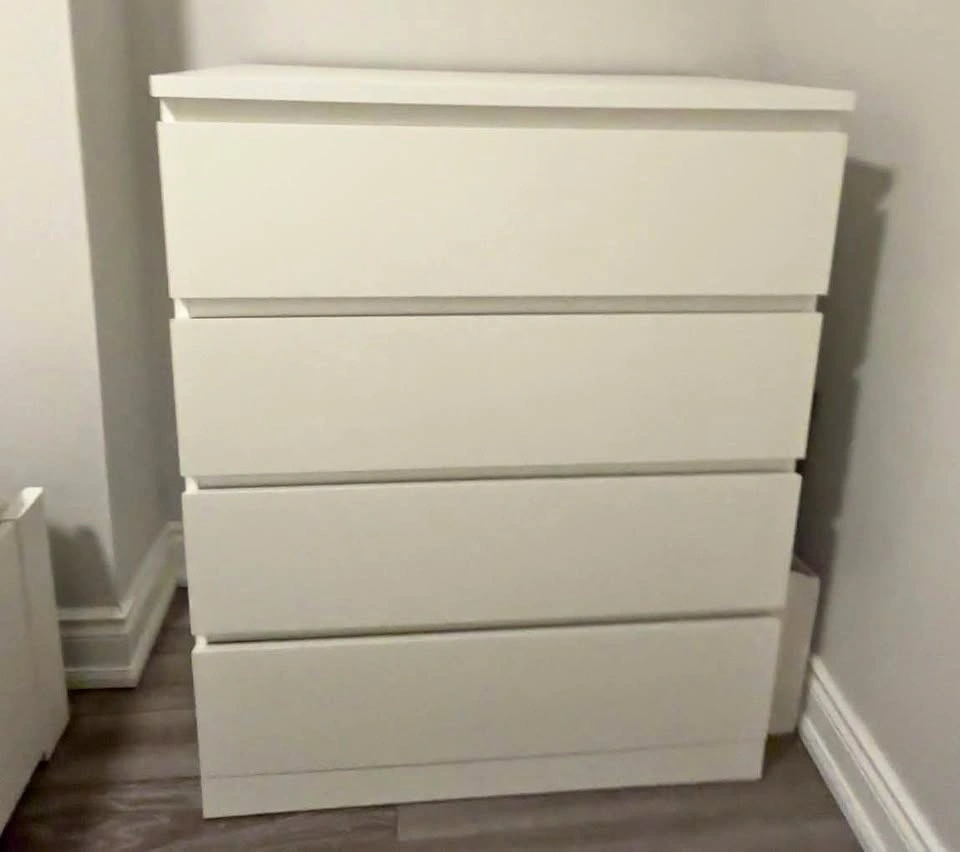 Selling an IKEA STORKLINTA 4-drawer chest in white. Used but like new — clean, sturdy, and well-kept. All drawers slide smoothly and the unlock/anchor function works perfectly. Great for a bedroom, condo, or extra storage. Details: 4 drawers, Colour: White, Size: 70 × 48 × 98 cm. Original IKEA price: $199.00. Asking: $140 or best offer. Pickup only.